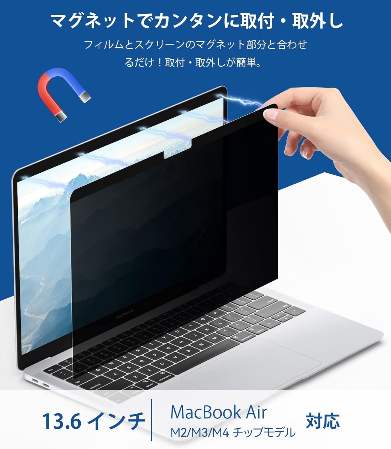 MacBook Air 13.6/13 (2022-2025、M2、M3、M4) 用 覗き見防止 マグネット式 プライバシーフィルター のぞき見防止 フィルム ブルーライトカット PC 液晶保護フィルム 両面使用可能 反射防止 着脱簡単 適格請求書発行可