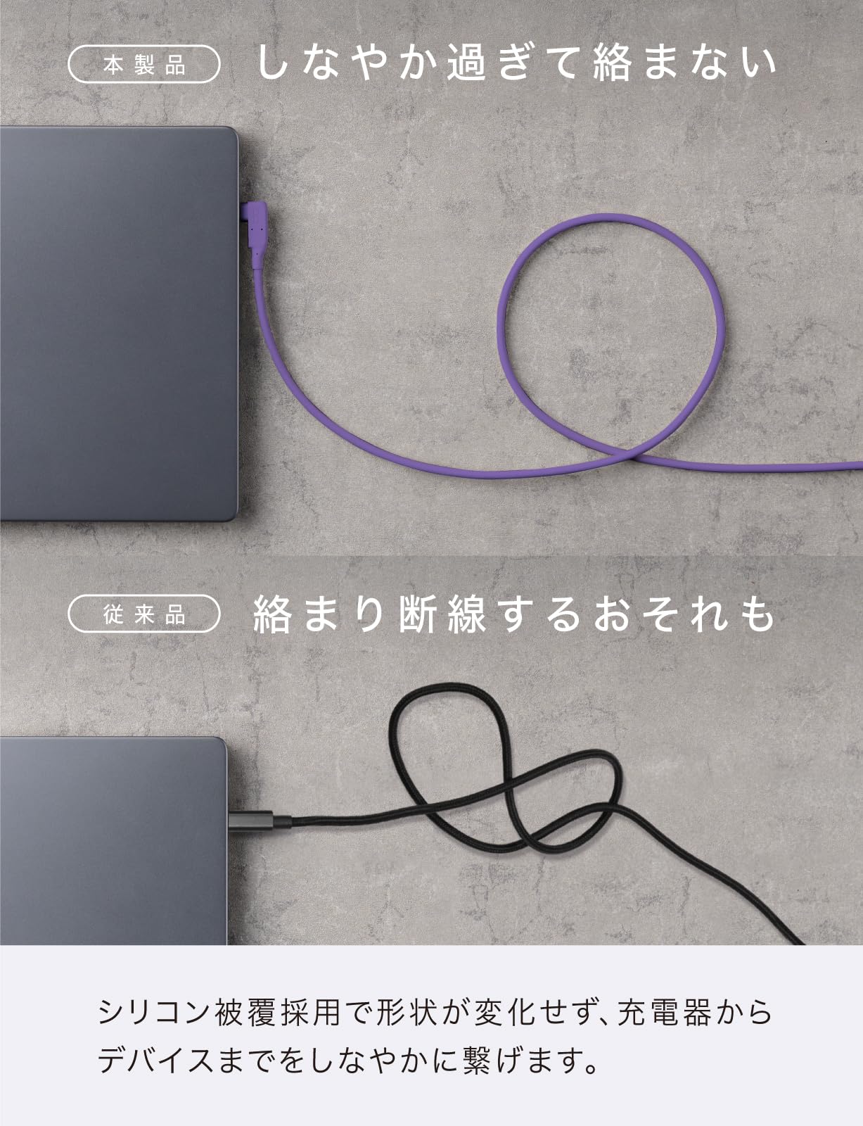■ 【しなやかなシリコン素材】外装にシリコン素材を使用したことで、従来のケーブルにはない柔らかい質感を実現しました。