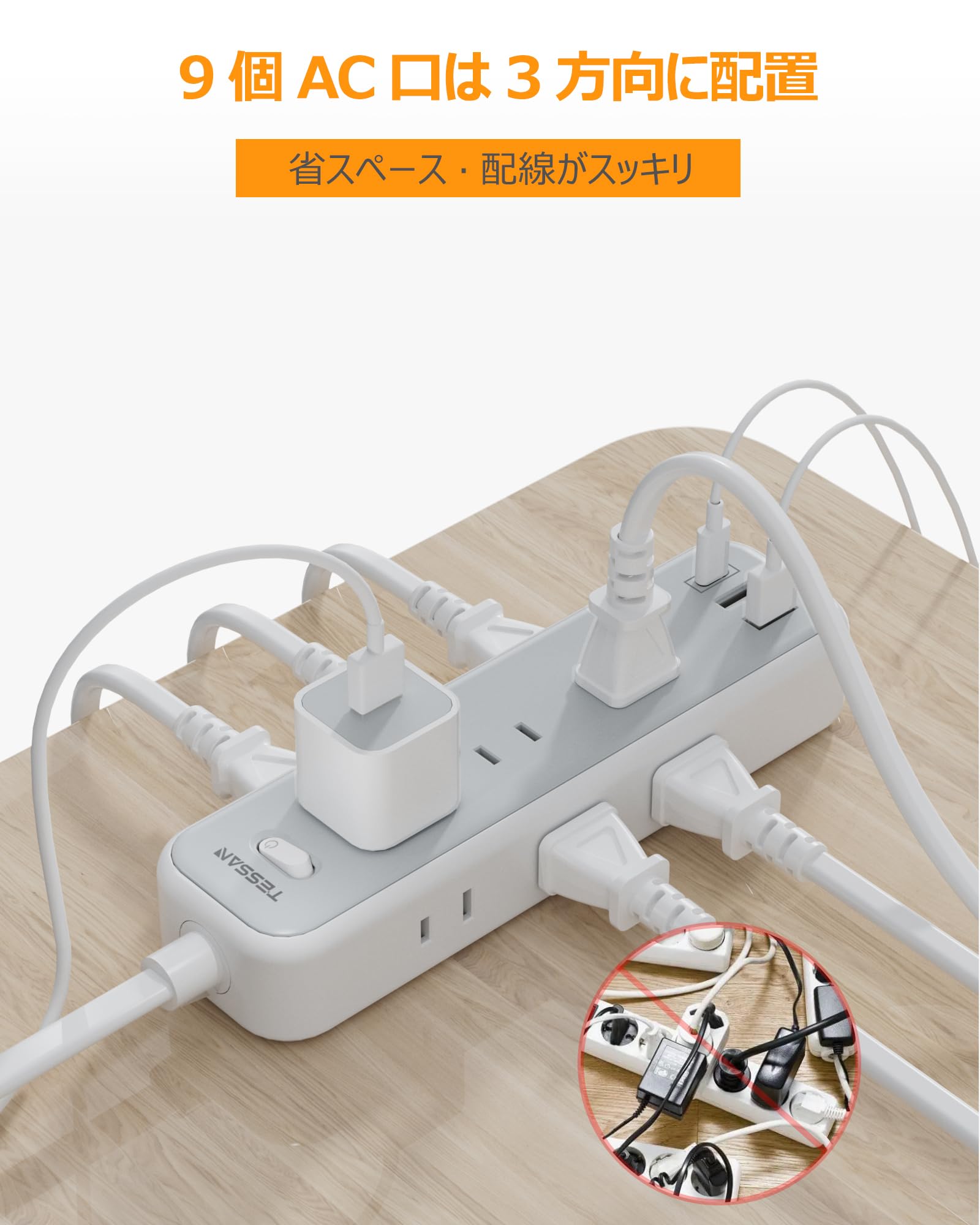 延長コード 2m 電源タップ usb-c たこあしコンセント テーブルタップ TESSAN 9AC口 1USB-C 2タイプA タコ足配線 マルチ 一括スイッチ付き oa 電源コード