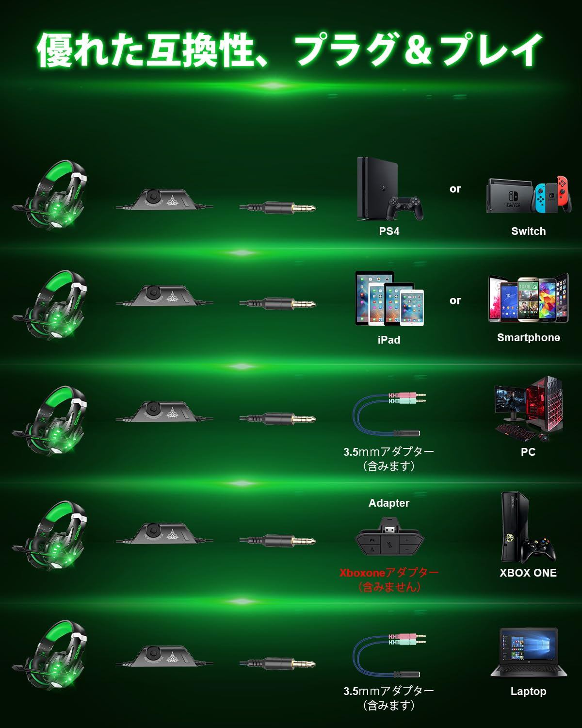 BENGOO ゲーミングヘッドセット PS5 ヘッドセット ノイズキャンセリング マイク付き 3.5mm有線 ゲーミングヘッドホン スイッチ ヘッドフォン 軽量 全効能 重低音 LEDライト コントローラー ミュート付き ステレオ FPS ゲーム用 Nintendo Switch Xbox One PS4 スマホ PC対応 (緑)