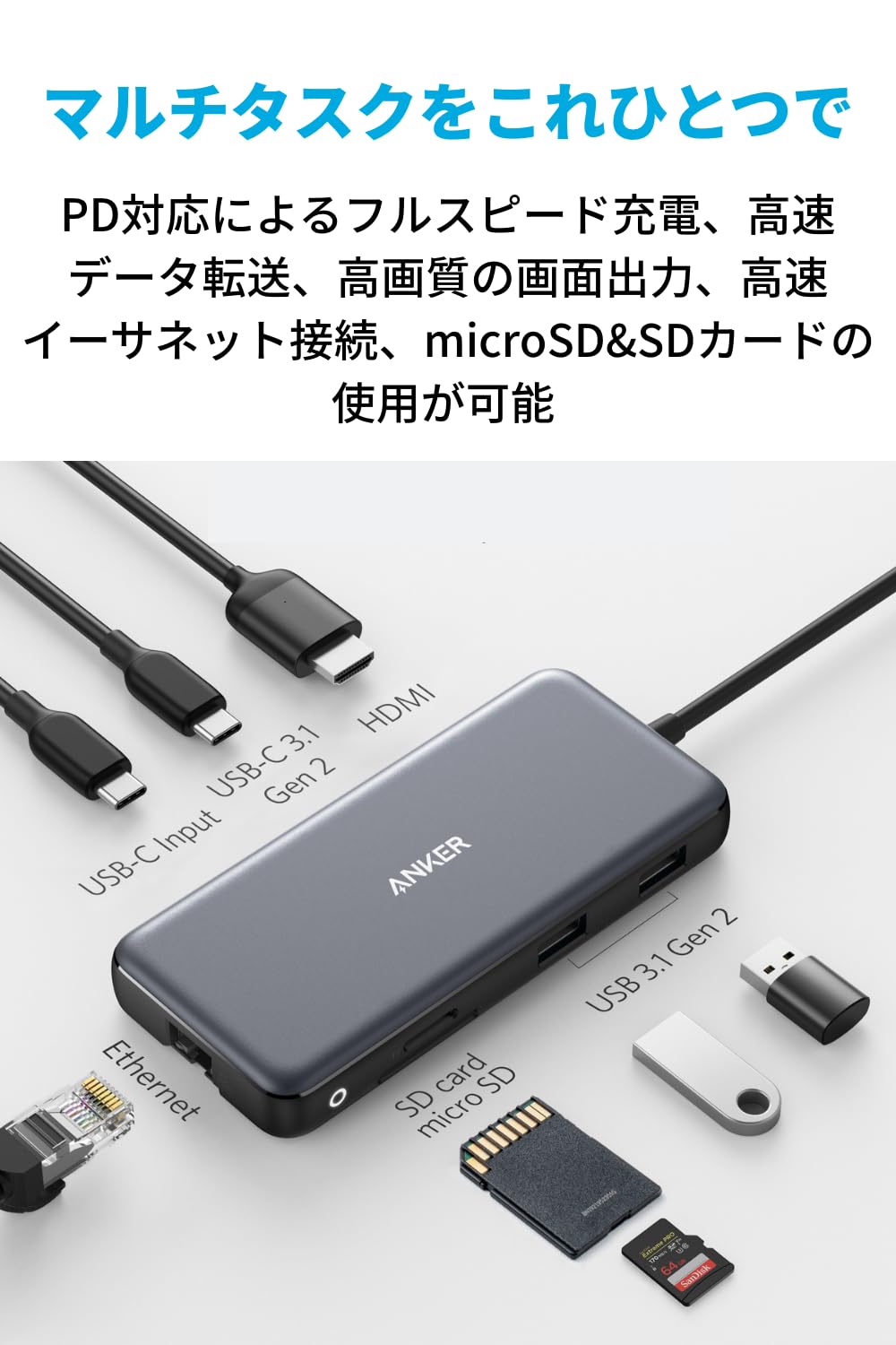 Anker PowerExpand 8-in-1 USB-C PD 10Gbps データ ハブ 100W USB Power Delivery 対応 USB-Cポート 4K (60Hz) 出力対応 HDMIポート 10Gbps 高速データ転送 USB-Cポート USB-Aポート 1Gbps イーサネット microSD&SDカード スロット搭載 MacBook Pro iPad Pro対応