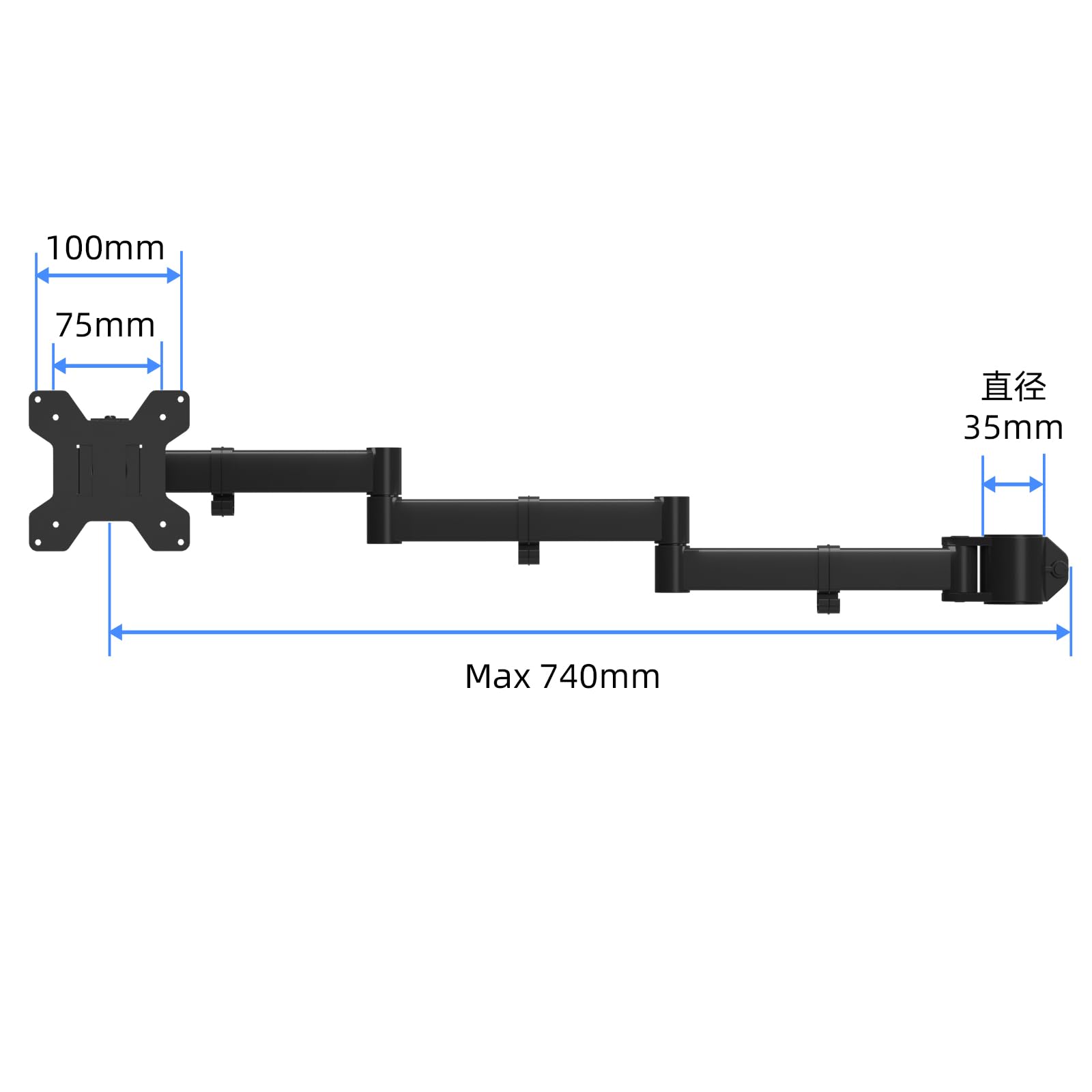 耐荷重:10kg▶対応サイズ:13-32インチ▶VESA規格:75×75mm、100×100mm▶アームの穴の直径:3.5cm▶最大延長:71cm(説明書がありません。