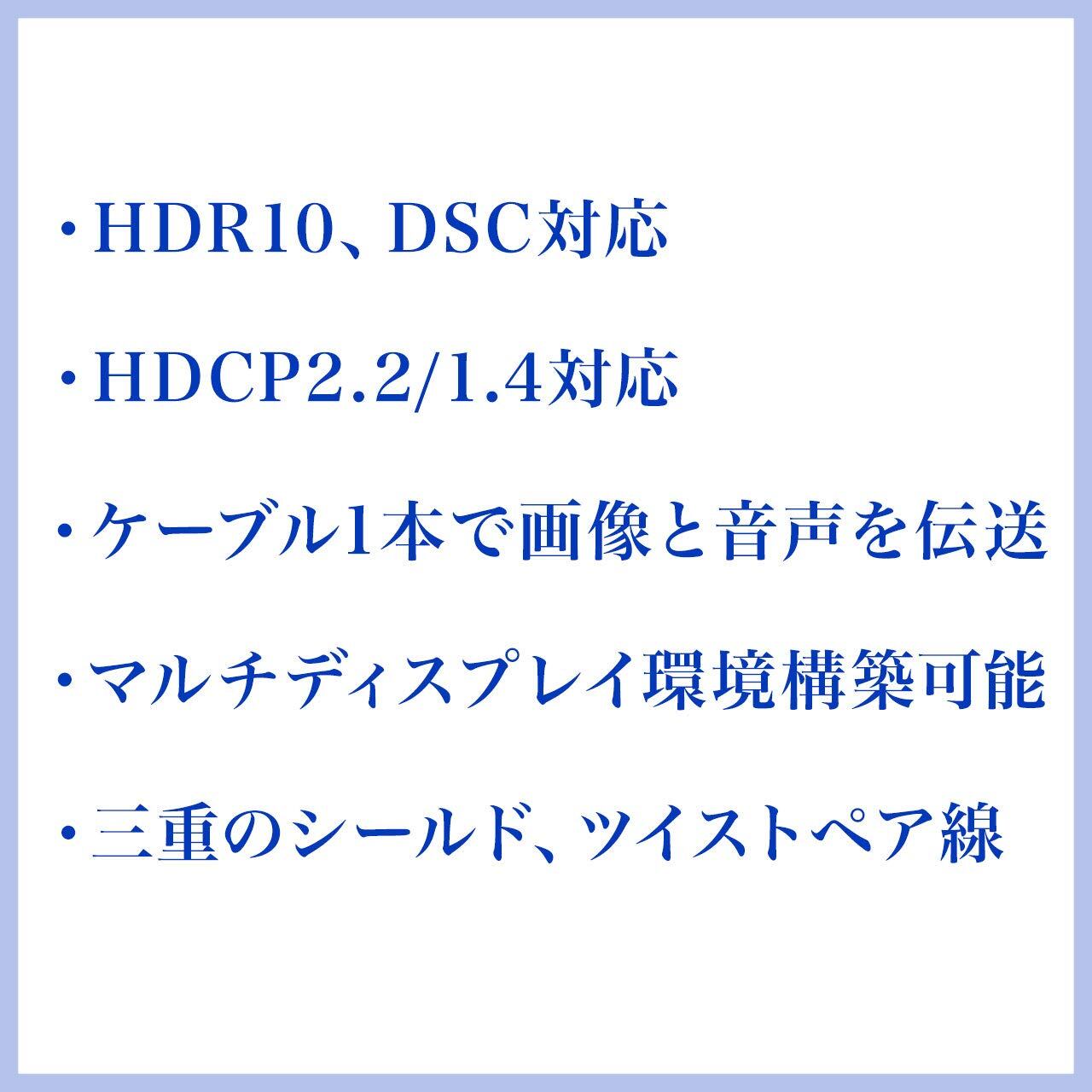 DisplayPort規格ver1.4認証取得品で、最大32.4Gbpsの伝送速度に対応し、最大8K/60Hz、4K/120Hzの高解像度表示が可能です。