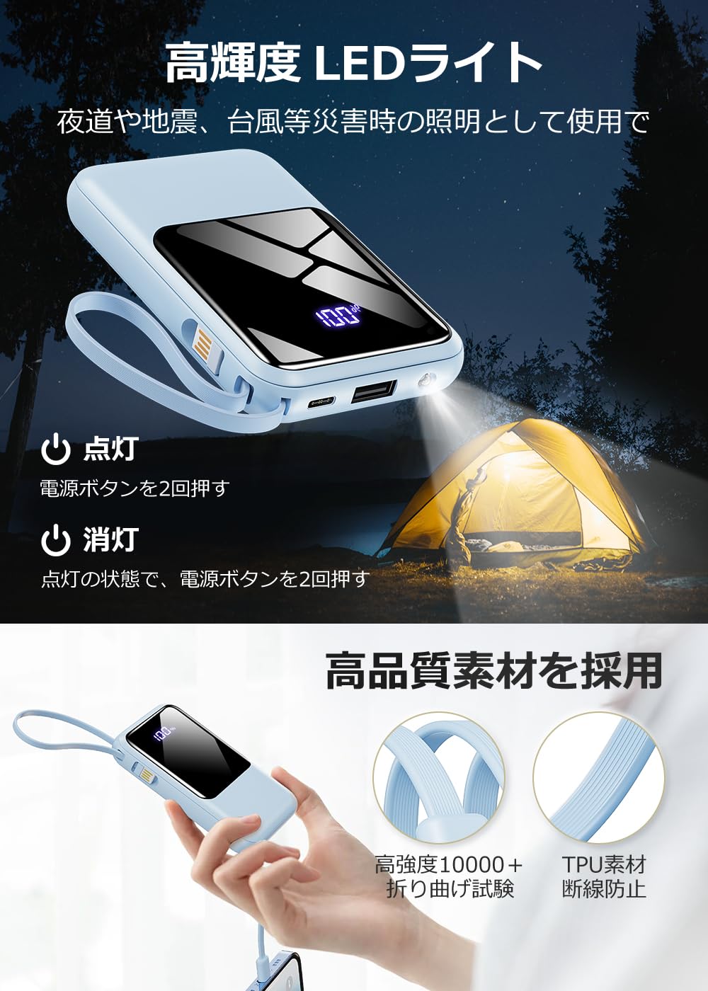 モバイルバッテリー 大容量 【22000mAh大容量・4本ケーブル一体型・急速充電】超軽量 小型 モバイルバッテリー 4台同時に充電 携帯充電器 USB-Type C入出力ポート LEDディスプレイ搭載 スマホ充電器 コンパクト 持ち運び便利 機内持込可能 LEDライト付き 旅行/出張/アウトドア/停電/防災緊急用 安全設計&PSE技術適合品 iPad/iPhone/Android全種機器対応