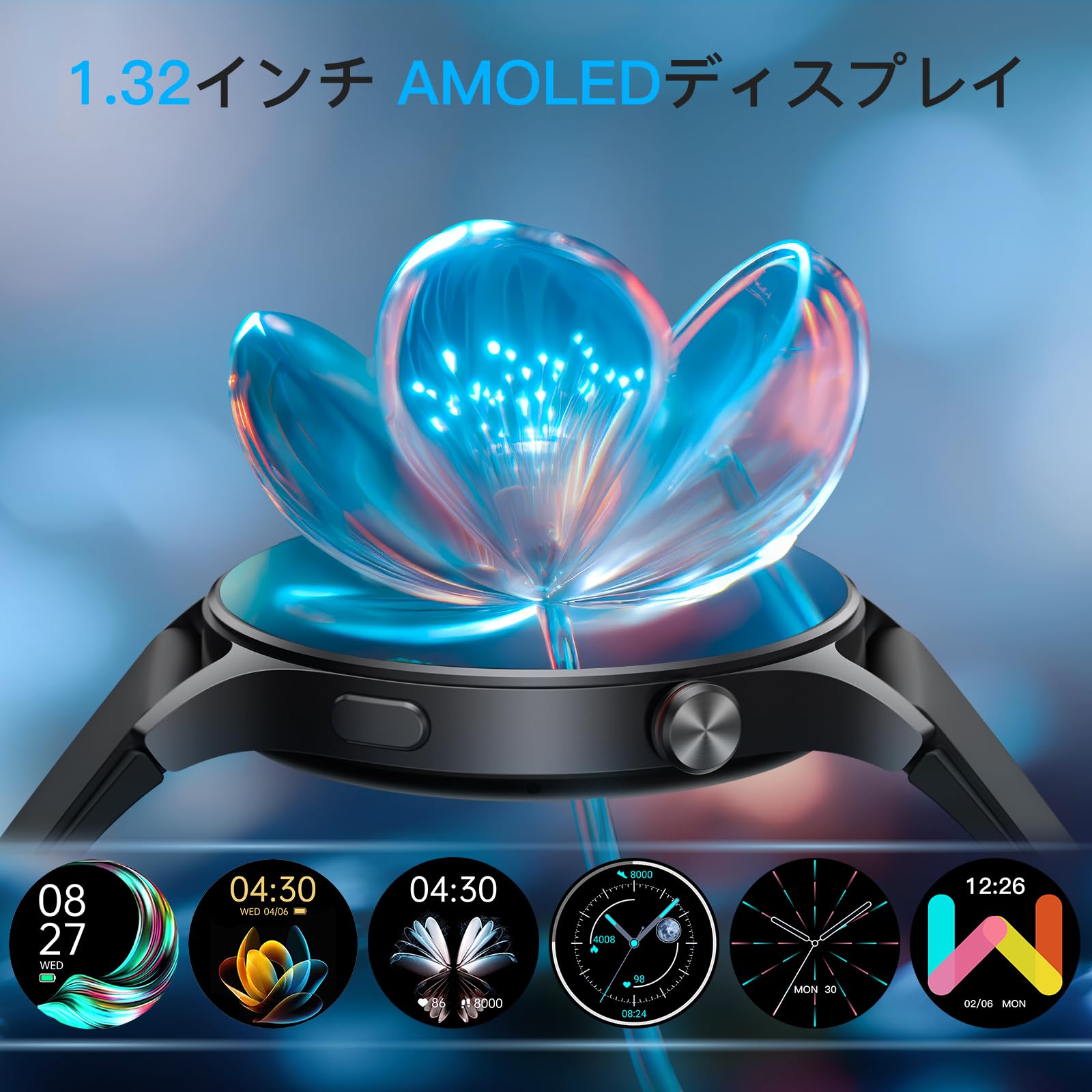 スマートウォッチ iPhone対応 アンドロイド対応 丸型,Line アプリ通知 2025新型,1.32インチAMOLEDディスプレイ 睡眠管理 BPM SP02 100+種類運動モード 12日長持ち 円型腕時計,IP68防水 常時表示 天気予報 160+文字盤 音楽制御 スマホ探し リモートカメラ 懐中電灯