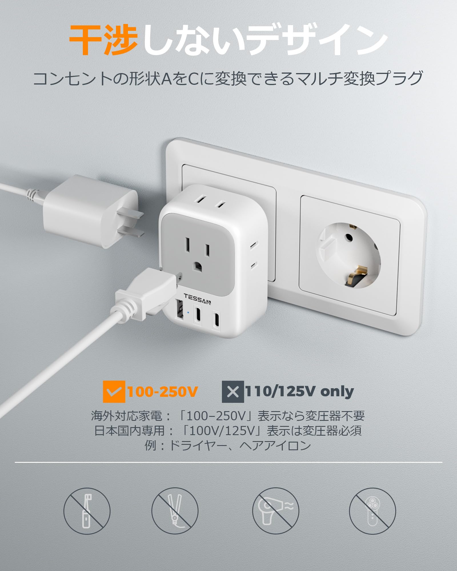 TESSAN 韓国 海外 変換プラグ 変換プラグ seタイプ 4個AC差込口 3USB(2USB-C)ポート付き ドイツ、フランス イタリア スペイン ヨーロッパへ旅行用便利