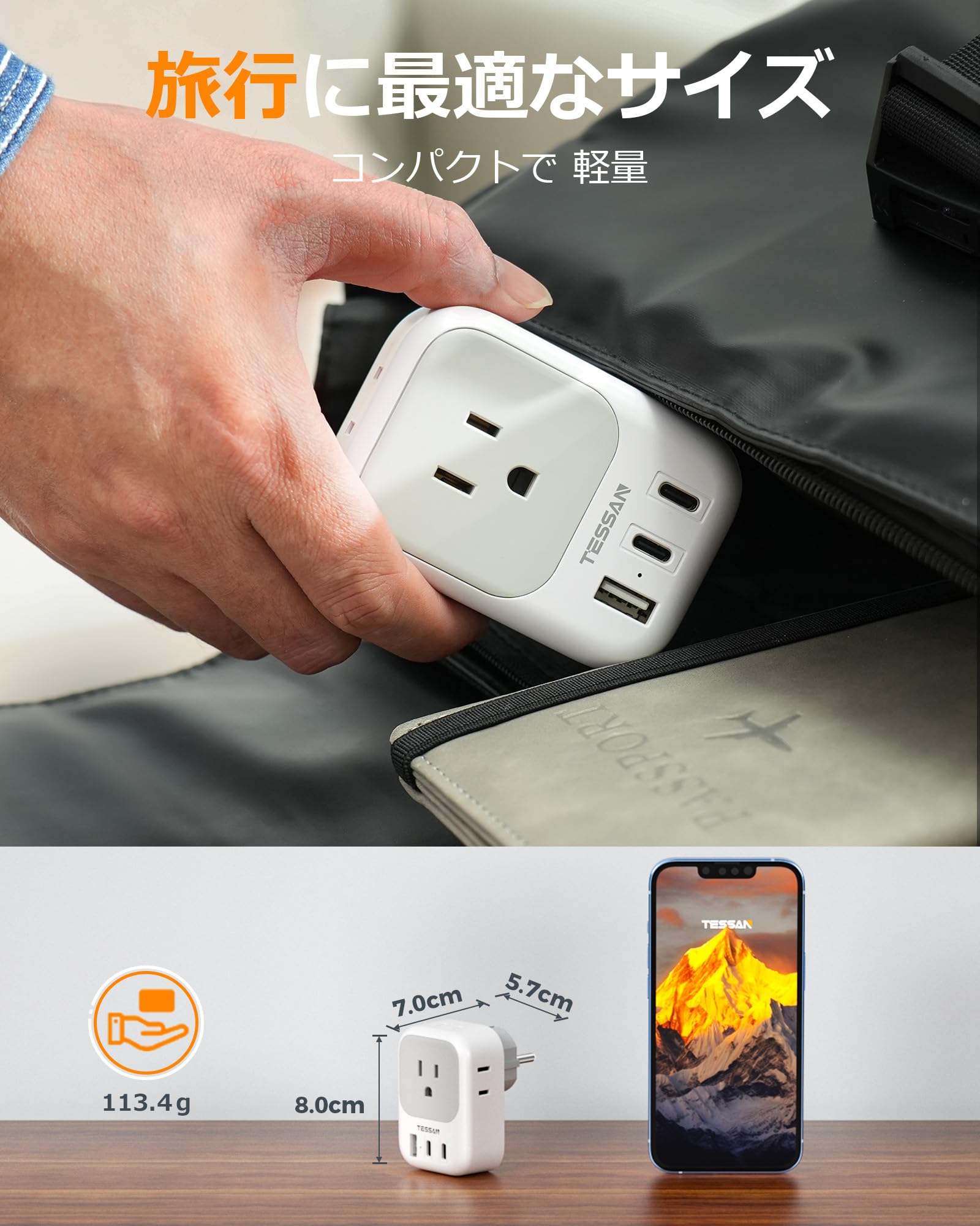 最大7台の機器を同時に充電でき、旅行先や出張先でありがちなコンセント不足を解消します。