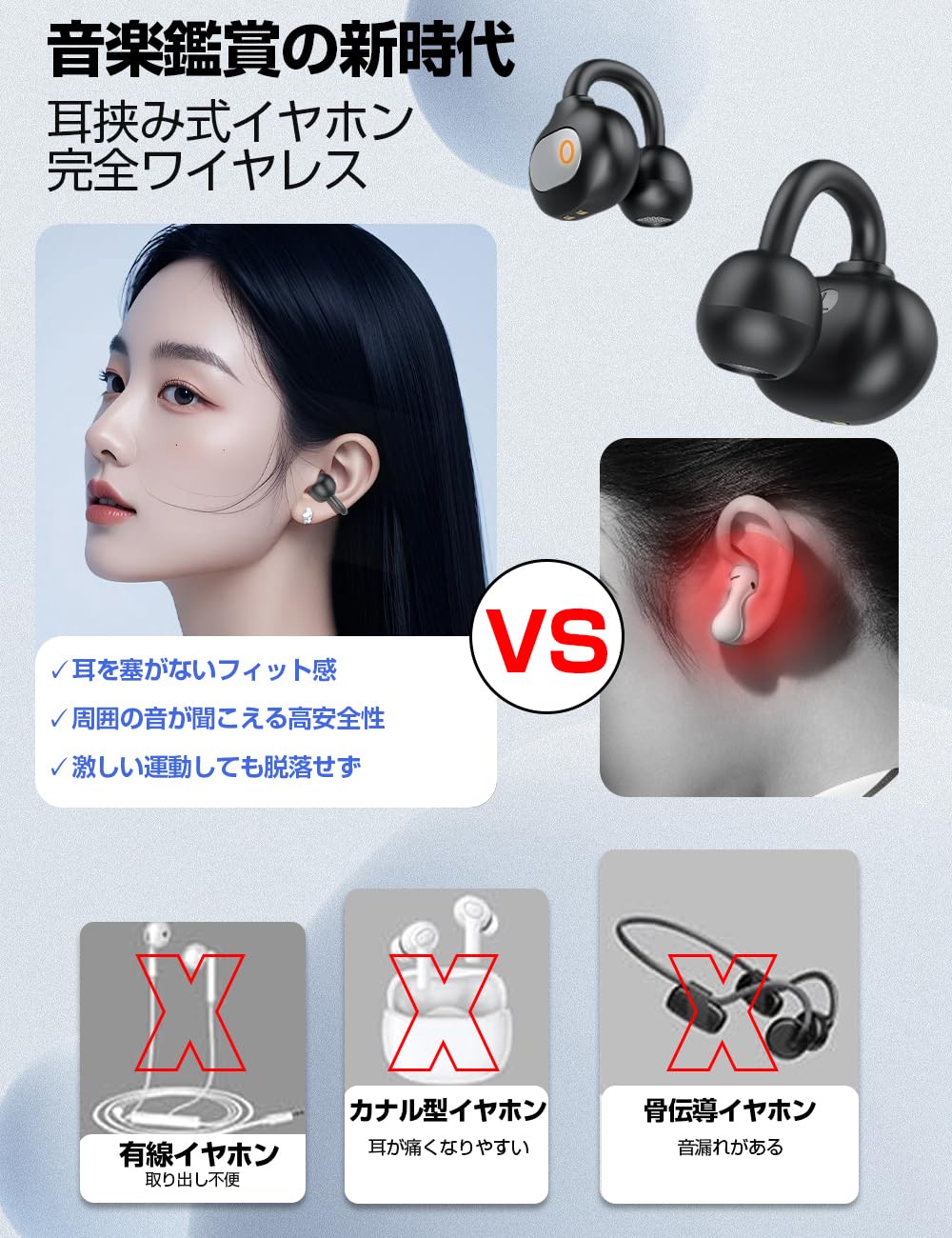 革新的な人体工学を応用して開発された、圧迫感がないイヤーカフ型イヤホン。