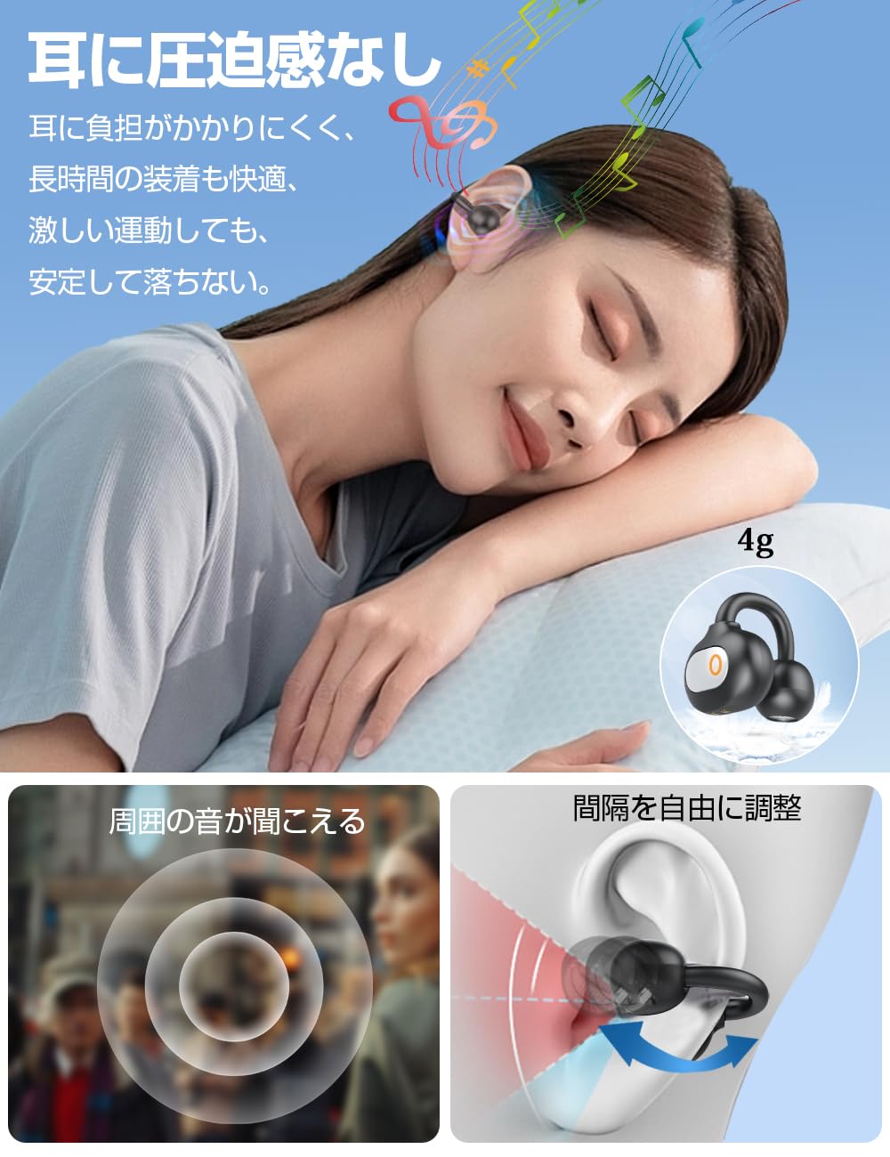 耳を塞がない開放感が得られ、耳への負担を最小限に抑えることができ、より快適な装着感を実現しています。