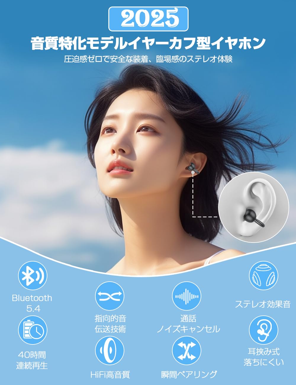 イヤホン Bluetooth ワイヤレスイヤホン【2025音質特化モデル 究極フィット感】Bluetooth5.4 耳挟み式 圧迫感ゼロ 業界トップ音質 残量表示 通話ノイズキャンセル 指向性音伝送技術 音漏れ抑制 骨伝導革新 軽い着装 落ちにくい 最大40時間連続再生 自動ペアリング Type-C急速充電 iOS/Android対応