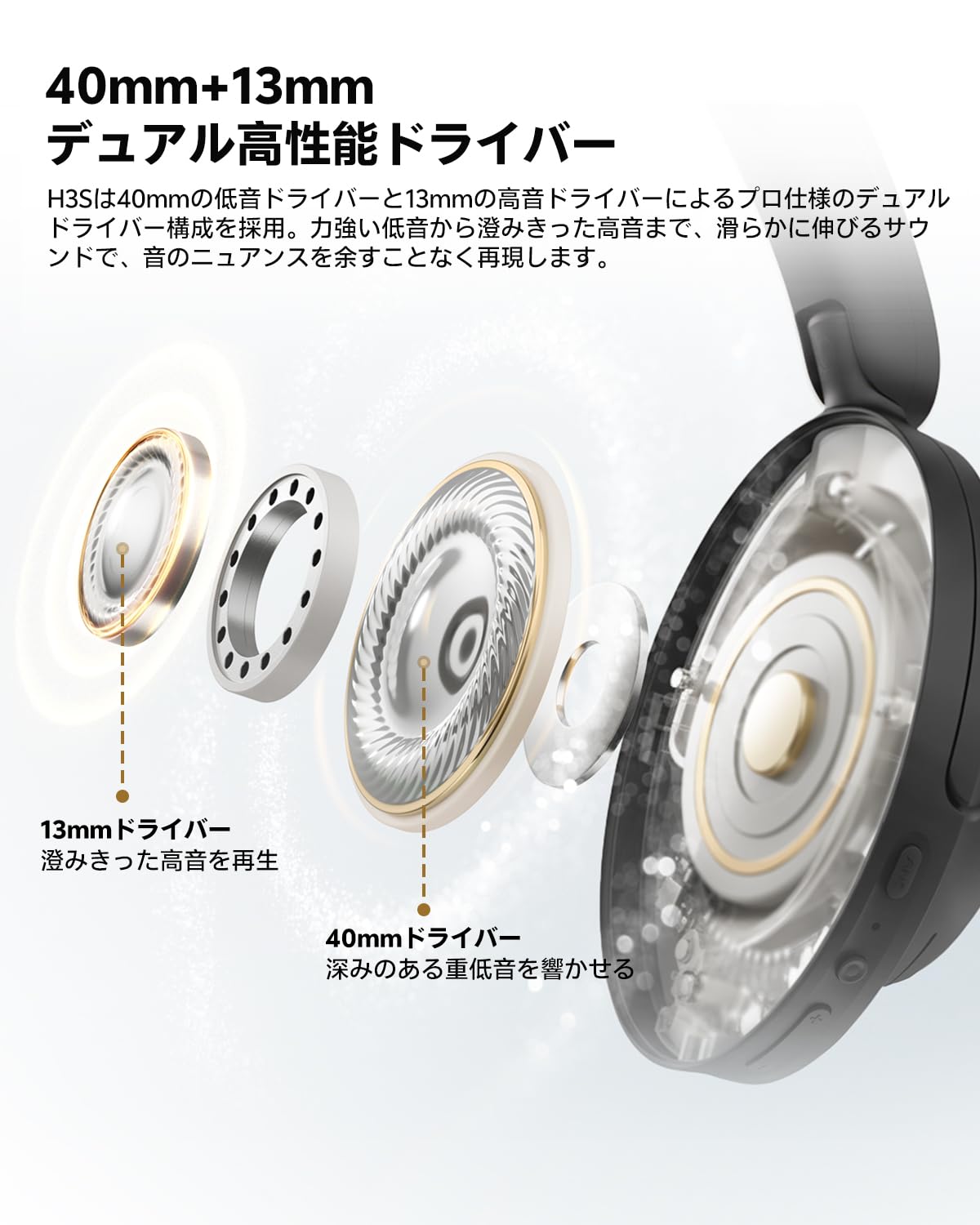 ■ 【デュアルドライバーで極上のサウンド体験を】40mmの低音ドライバーと13mmの高音ドライバーによるプロ仕様のデュアルドライバー構成を採用。