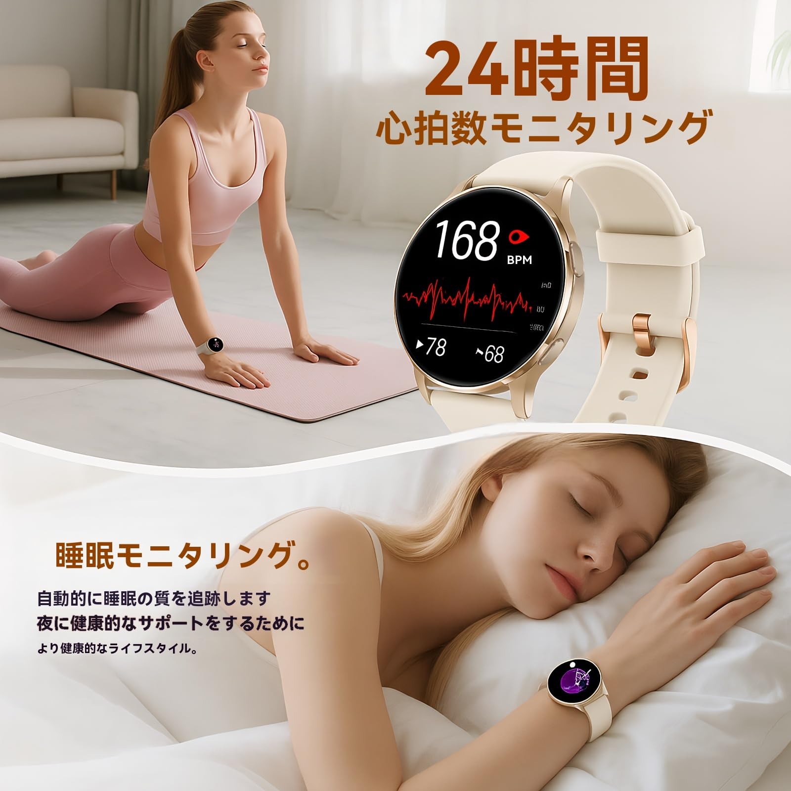 スマート ウォッチ【2025年 新モデル・超薄型・超軽量】 iPhone対応 アンドロイド対応 丸型 1.27インチ 通話機能 通話通知 活動量計 腕時計 IP68防水 100種類運動モード 文字盤切替 音楽再生 スポーツウォッチ 天気予報 カメラ操作 心拍数測定 スポーツ'スマートウォッチ レゼントに最適 (ベージュ)