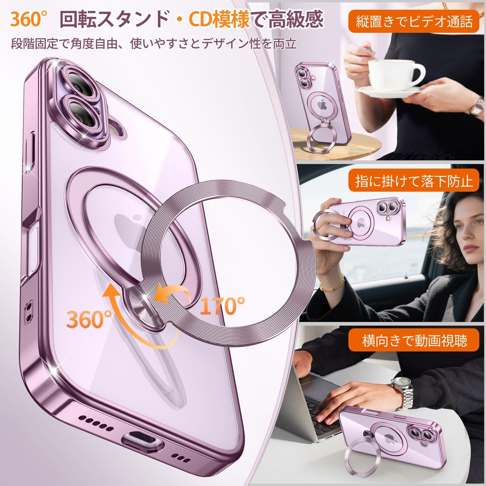 iPhone 17 用 ケース MagSafe対応 光沢CD紋様リング 360°定点回転スタンド 縦横両対応 マグセーフ対応 メッキバンパー キラキラ 背面クリア 精密開口レンズ保護 いphone 17 ケース Gunwon スマホケース 米軍規格 耐衝撃 黄変防止 マグネット付け 超強磁力 ワイヤレス充電 ストラップホール付き アイフォン17用 携帯ケース「ピンク」