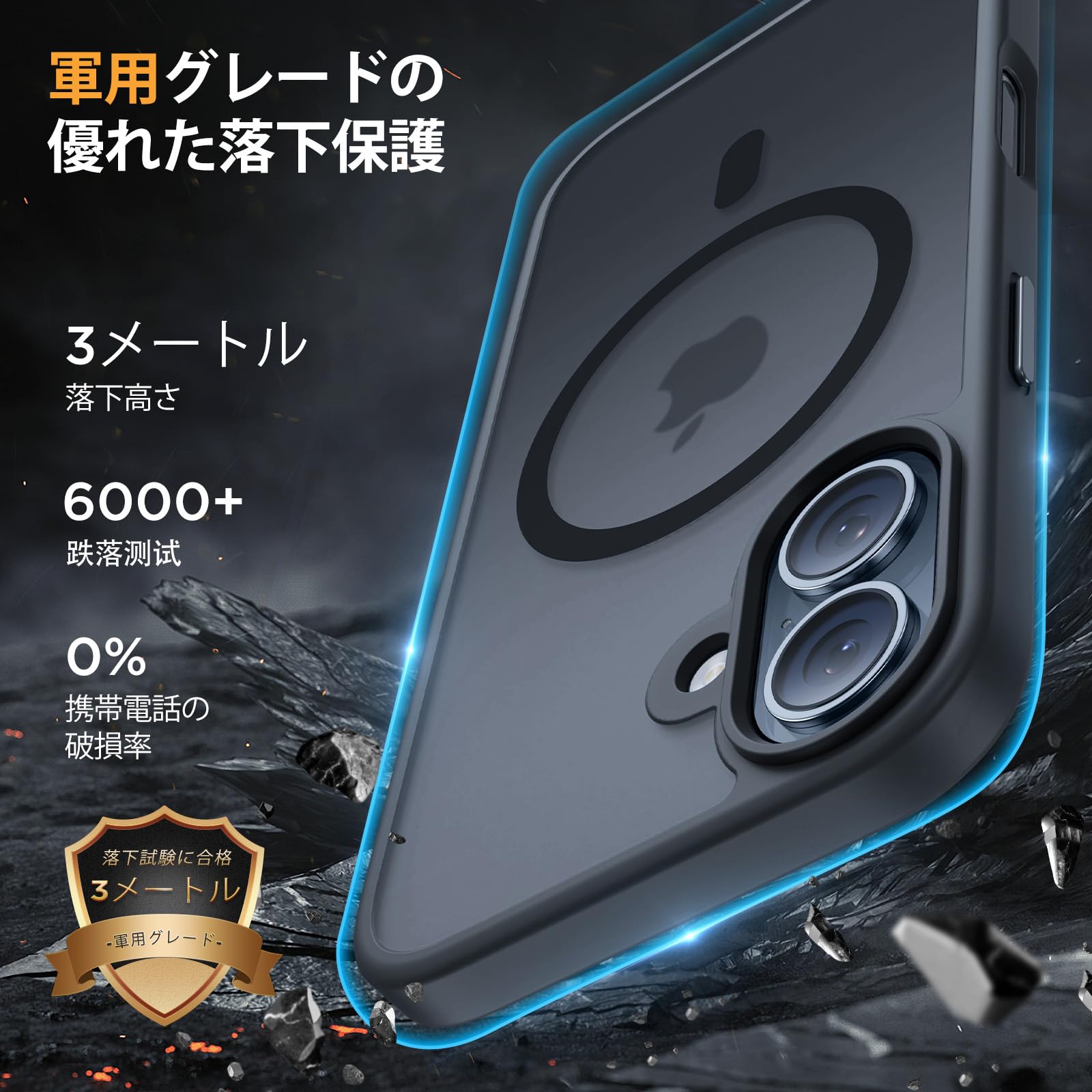 3メートル高さからの6,000回落下試験をクリア,試験端末破損ゼロ,日常の落下衝撃からスマートフォンを確実にガード。
