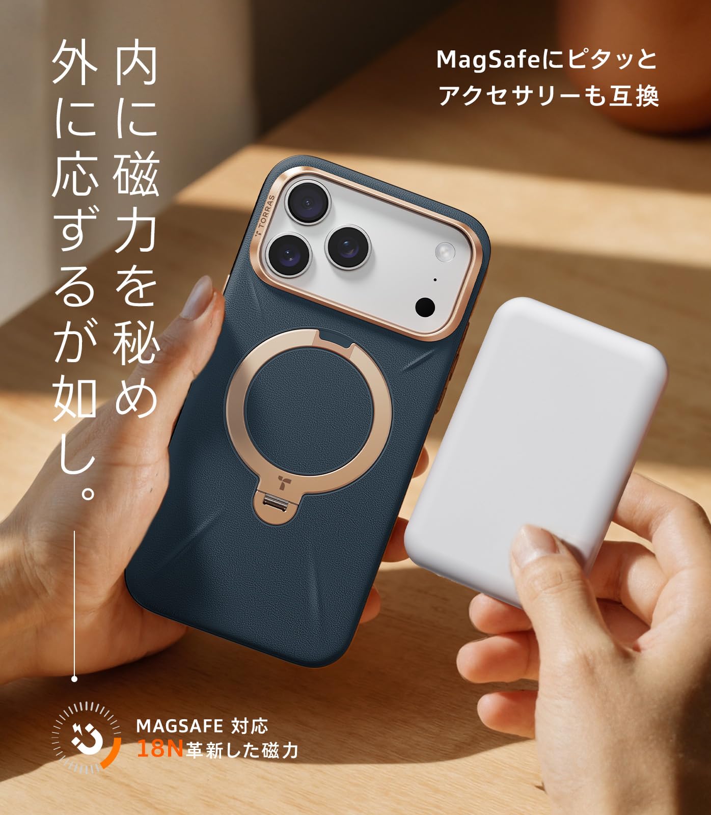 MagSafe 対応にはハルバッハアレイ特許技術による磁石配列を採用,最適化された磁力で MagSafe 充電器やアクセサリーをしっかり吸着固定、ガタつきなく安定接続し、持ち運び時の脱落を防ぐ。