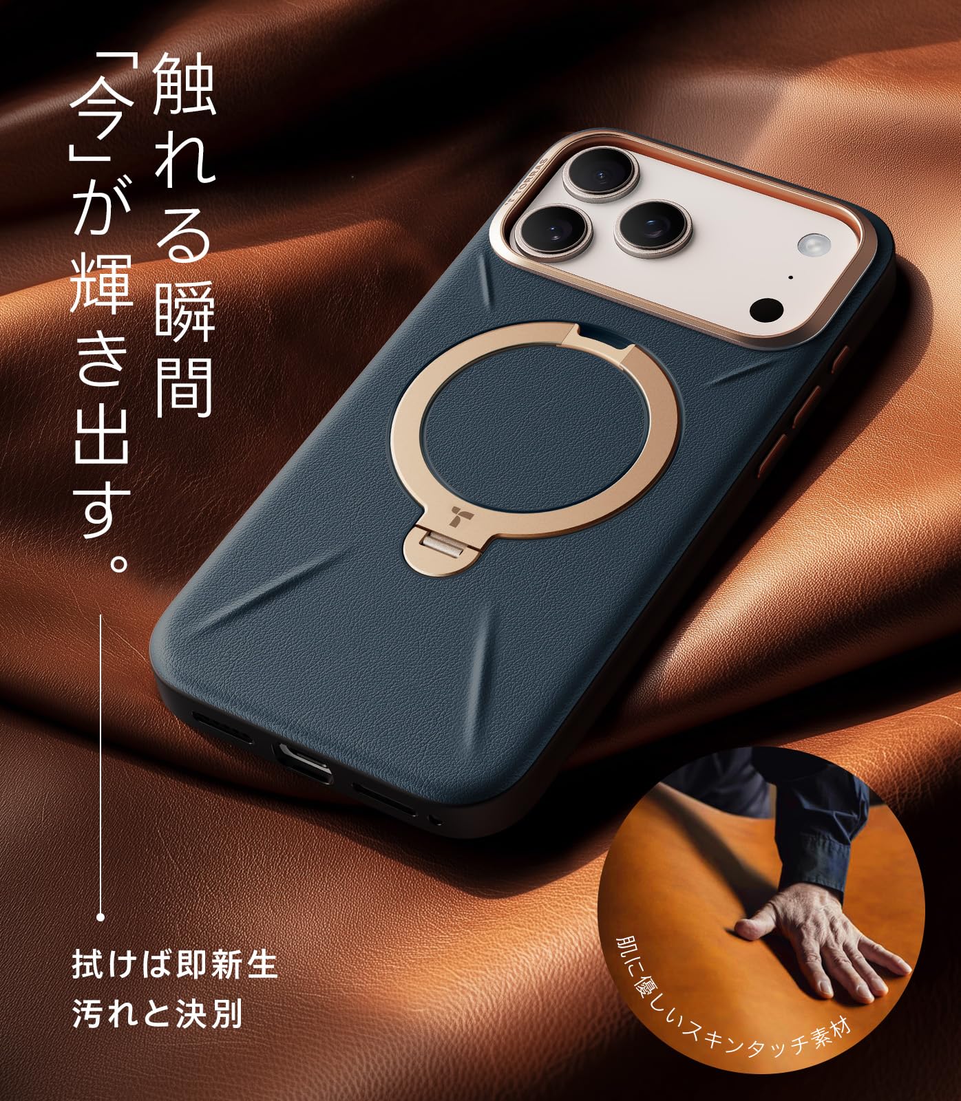 TORRAS iPhone 17 Pro Max 用 ケース【新感覚レザー・スキンタッチ】Ostand Q3 レザートーン MagSafe対応 リング スタンド 360°定点回転 縦横両対応 マグネット搭載 革 カメラコントロールボタン 米軍規格 耐衝撃 指紋防止 サファイア・ディープブルー
