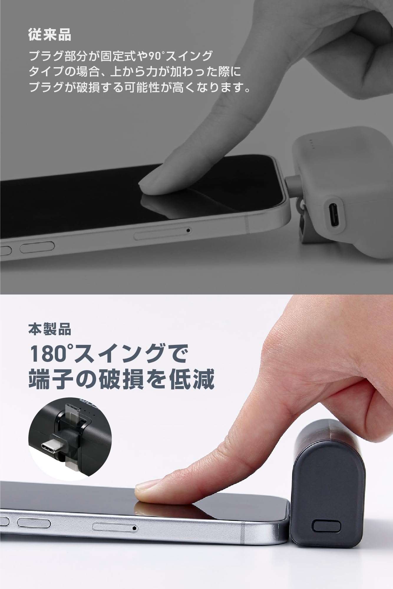 余計な負荷からコネクターを守り、収納時は90度に折りたたんで心配なく持ち運べます。