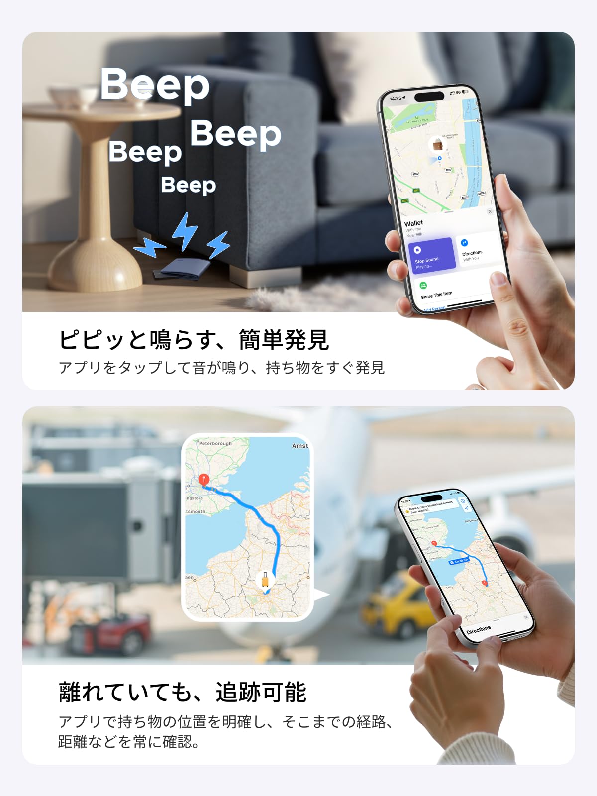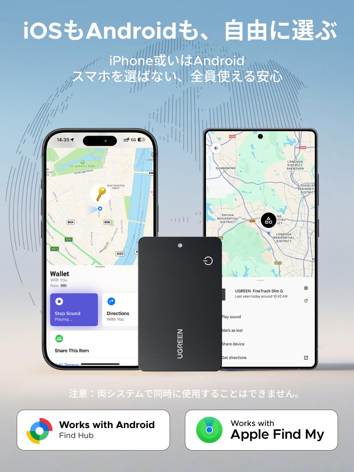 ■ Google・Apple公式認証で安心使用:この スマートトラッカーはGoogleの「Find Hub」とAppleの「探す」ネットワークの両方に対応した公式認証品です。