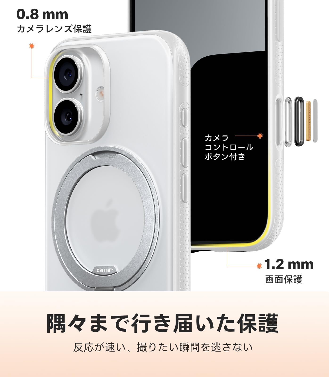 TORRAS iPhone 17 用ケース 【カチカチ・多機能360度回転スタンド】リング Ostand O3 Fitness MagSafe対応 米軍MIL規格耐衝撃 スタンド 指紋防止 黄変防止 カメラコントロールボタン付き ストラップホール 半透明 撮影/動画視聴/日常の記録 手のひらサイズの映像革命 ホワイト