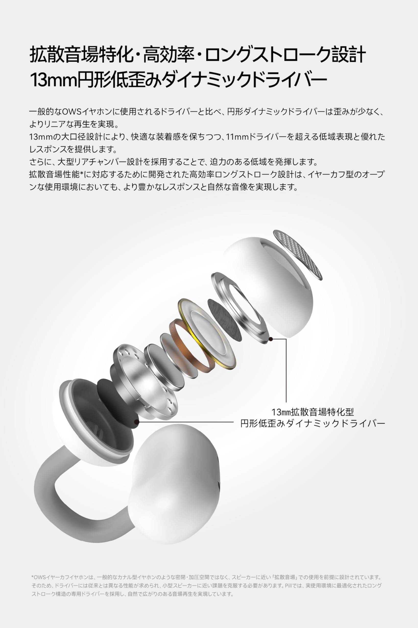 ■ 【13mm円形低歪みダイナミックドライバー】一般的なOWSイヤホンに使用されるドライバーと比べ、円形ダイナミックドライバーは歪みが少なく、よりリニアな再生を実現。