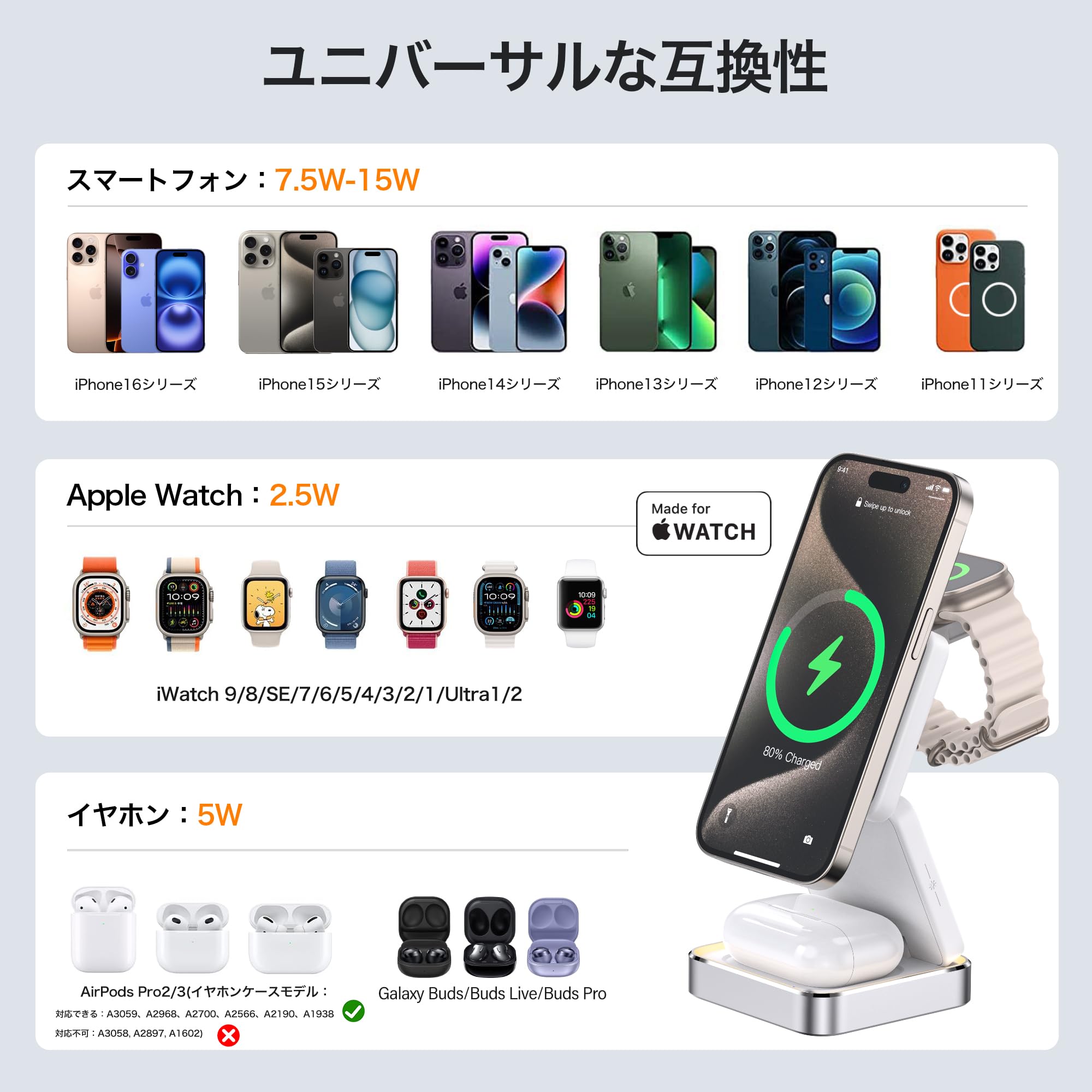 iPhone 17/16/15/14/13/12シリーズ(Magsafeケース装着時のiPhone 8~11)、すべてのApple Watchシリーズ、AirPods Pro/4/3/2(ワイヤレス充電ケース装着時)に同時に対応しています。