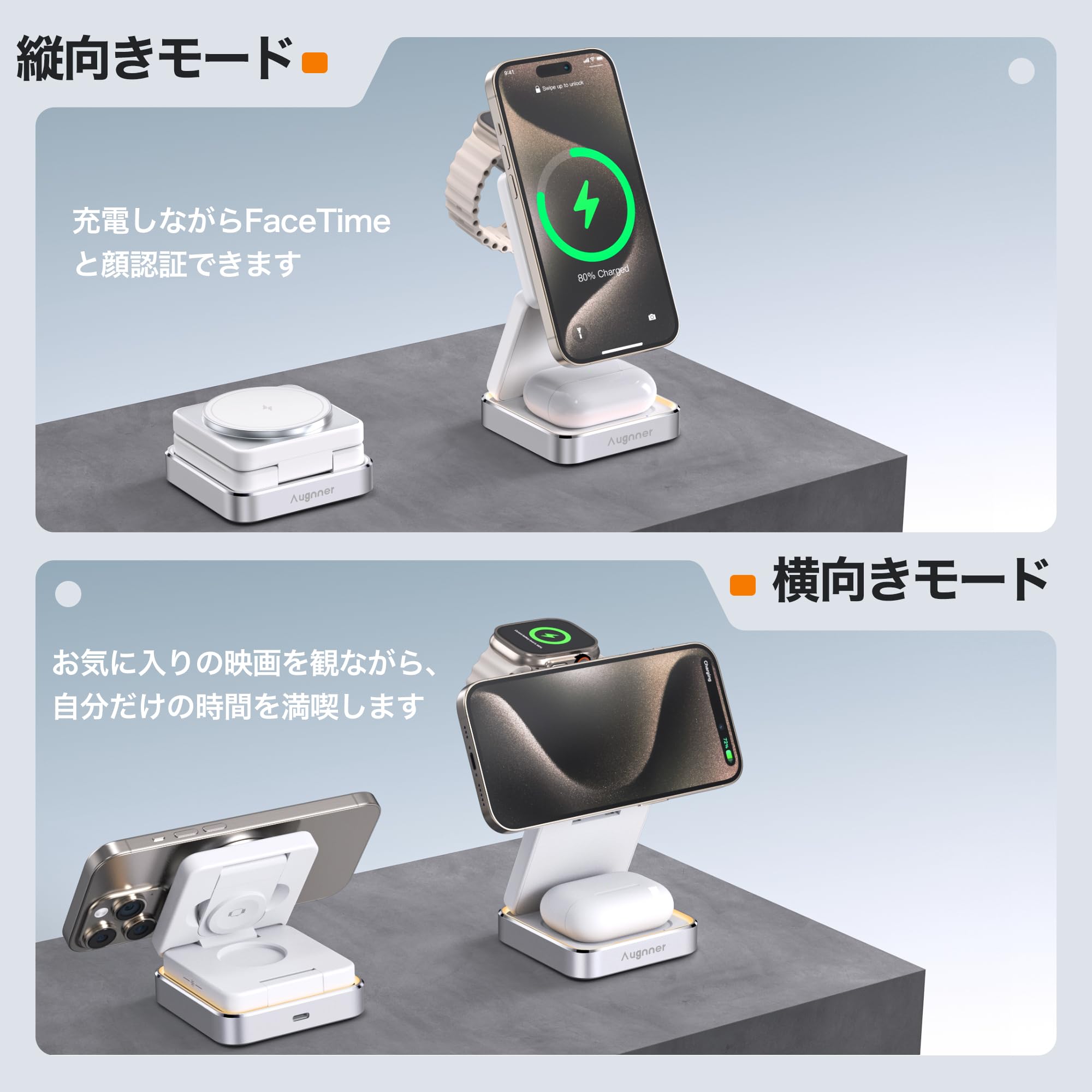 ■ 【折りたたみ式合金設計】Augnner 3-in-1 マグネット式ワイヤレス充電器は、新デザインとアップグレードにより、外観、充電速度(最大15W)、安全性が大幅に向上しました。