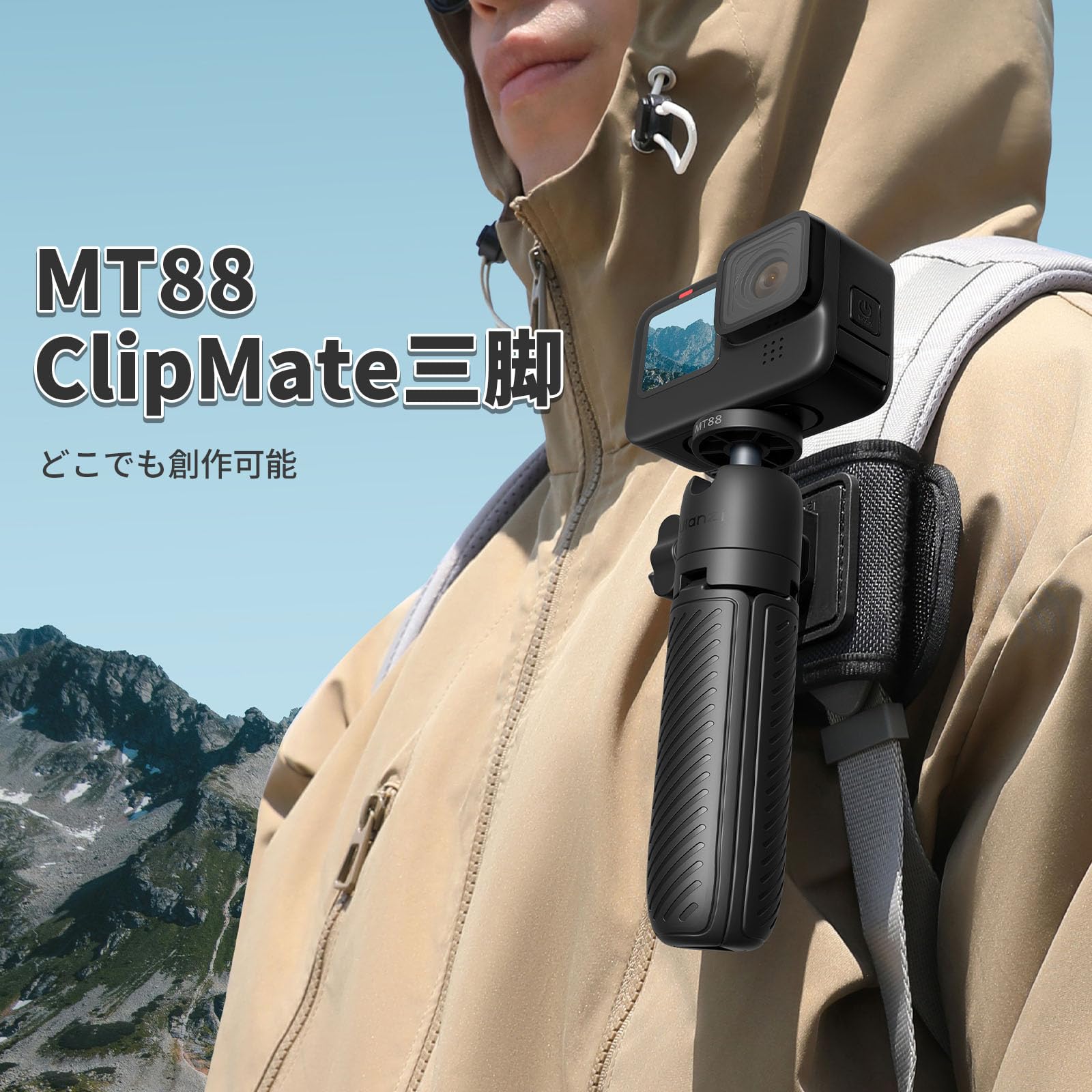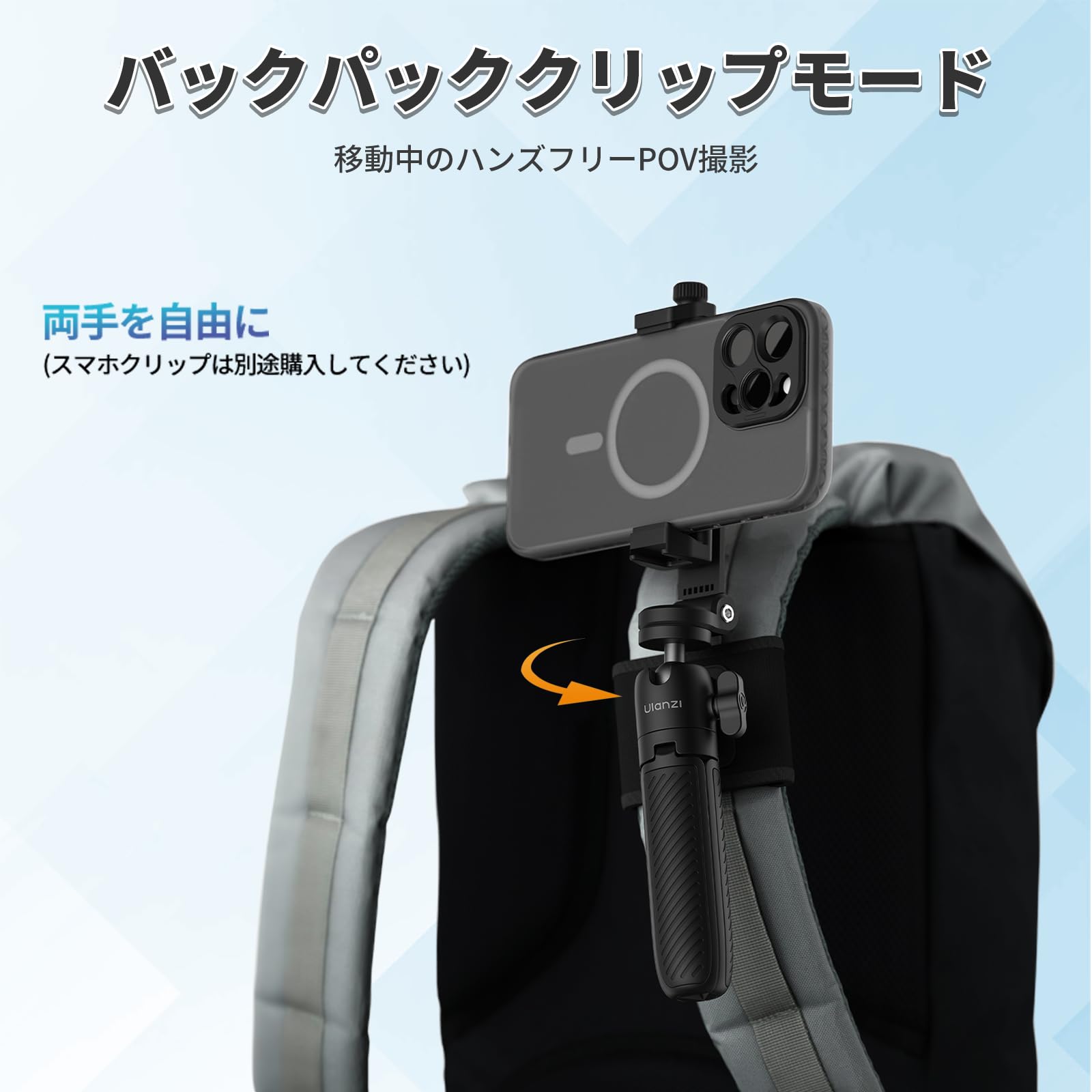 ■ 【バックパックのストラップ用ベルクロ】Clipmate三脚はストラップのスロットに取り付け、下に引くとロックされ、上げると解除されます。