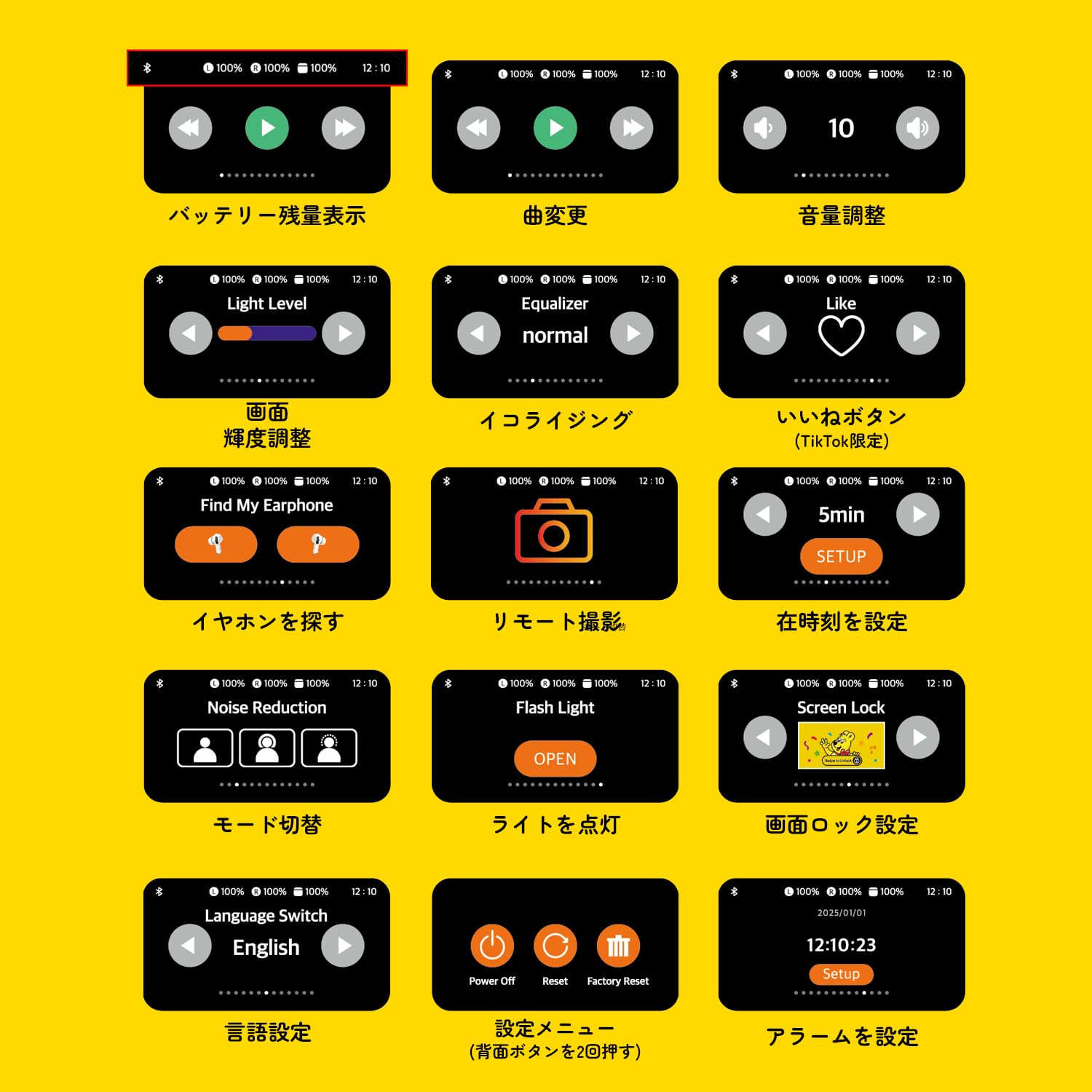 音楽再生・通話・ノイズキャンセリング/外音取り込み・音量調整・カメラ操作・言語切替・壁紙変更・画面輝度調整・イヤホン探索・懐中電灯・タイマーなど多彩な操作に対応(※ANC機能は耳の健康と安全性を考慮して設計されており、必要な音を聞き取れるよう配慮されています。