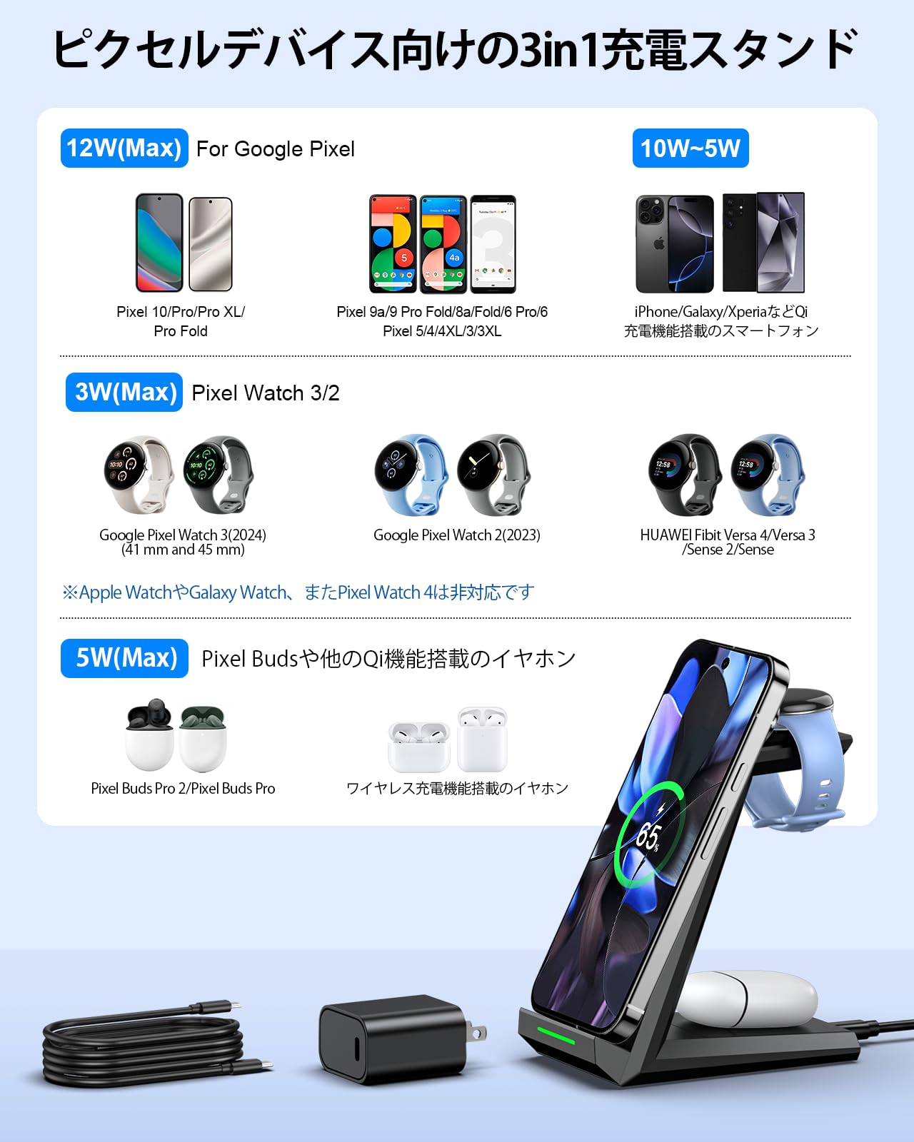 NANAMI 3in1 ワイヤレス充電器 Google Pixel専用 15W 高速充電 Pixel 10/9 Pro XL/9/Fold/8/7/7A/6 Pixel Buds Pro 2/Pro ピクセルウォッチ 3/2 Fitbit Versa 4/Sense 2 iPhone 17/16 Galaxy S25(Ultra) 各種機器対応 充電スタンド 20W出力アダプター付属 (ブラック)