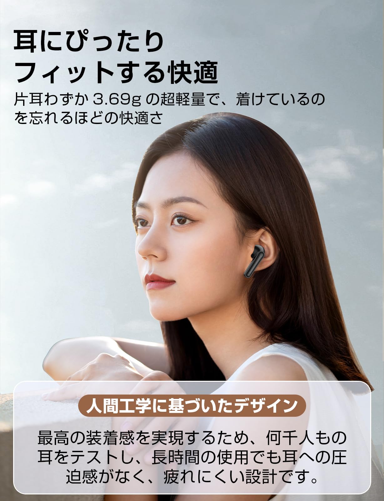 片耳わずか3.69gの超軽量で、装着感は羽のように軽く、着けているのを忘れるほどの快適さを提供します。