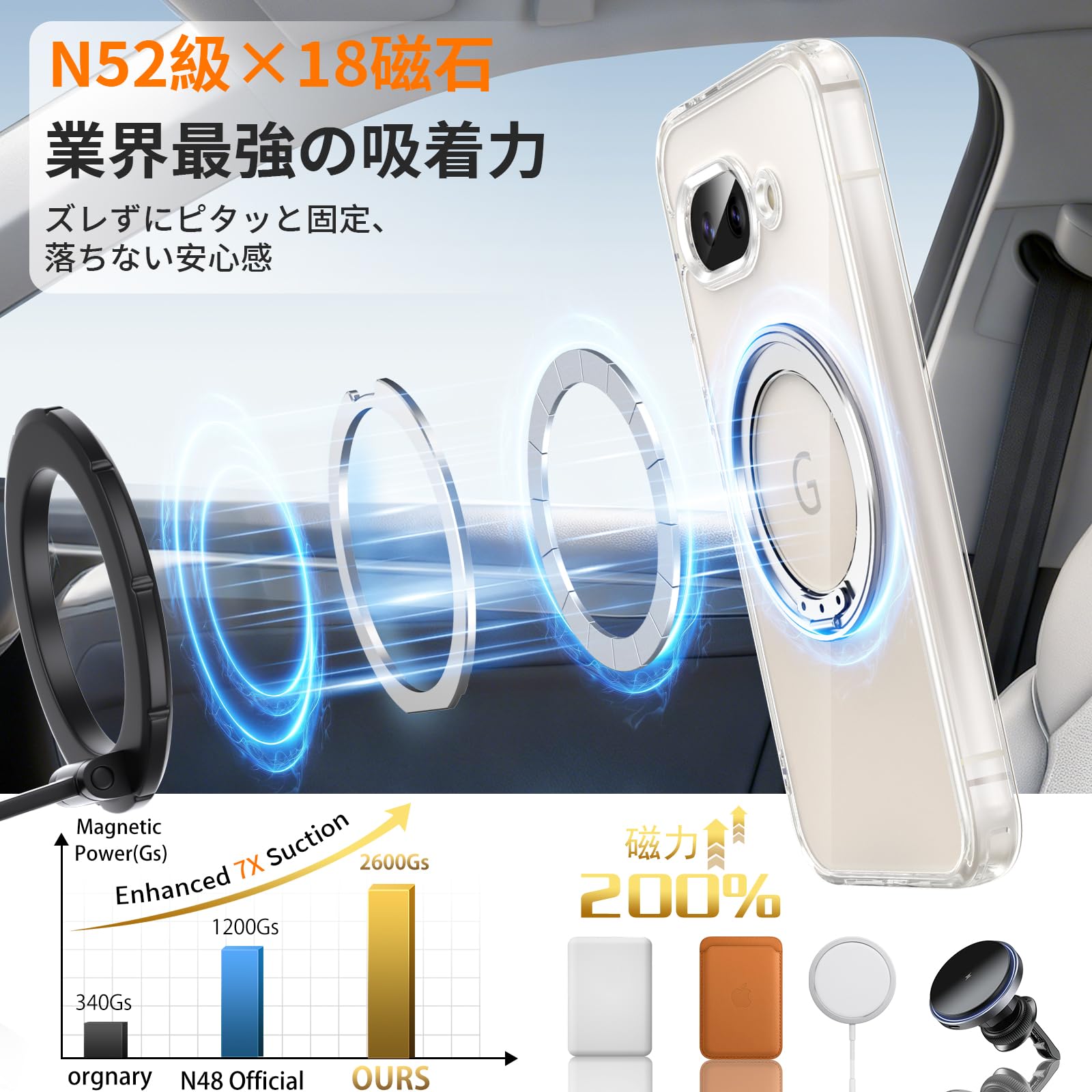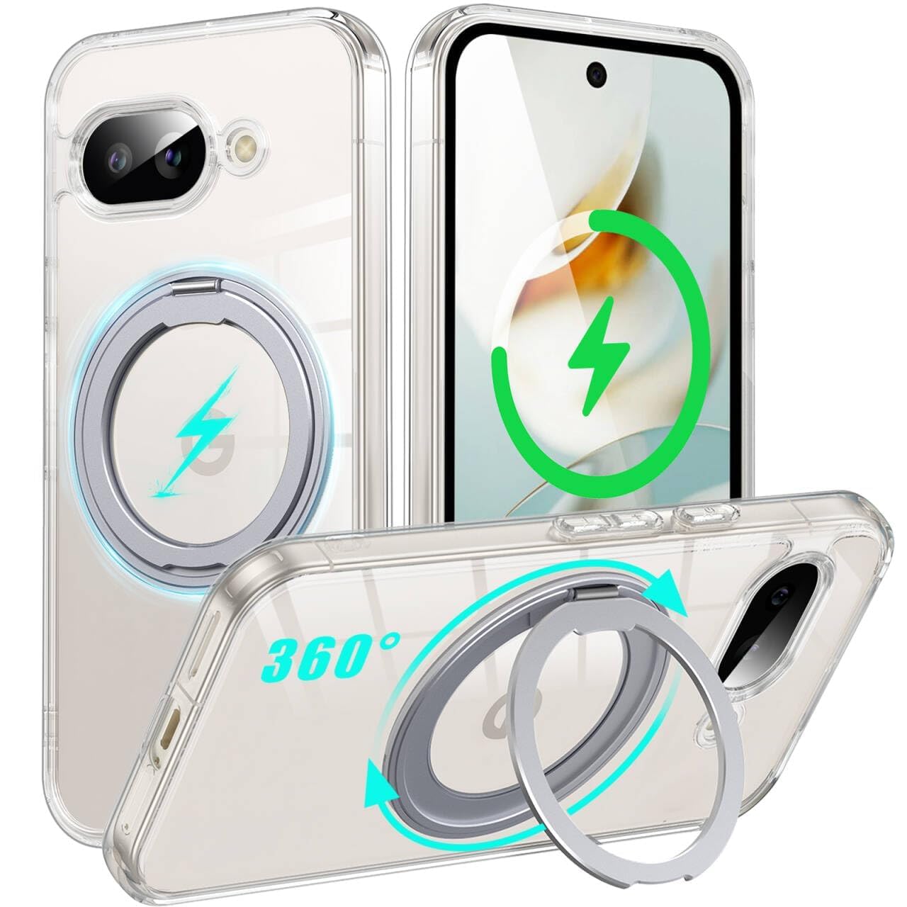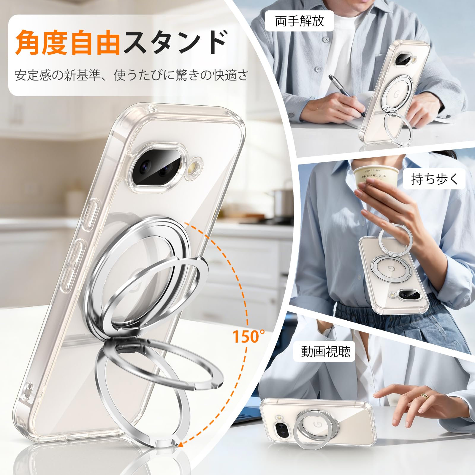 Google Pixel 9a 用 ケース Magsafe対応 360°回転スタンド Google ピクセル9a 携帯ケース リング マグネット搭載 ワイヤレス充電 縦横多角度 対応 カバー Uovon スマホケース 車載ホルダー ストラップ穴付き 透明 指紋防止 黄变防止 米軍MIL規格 ・ クリア
