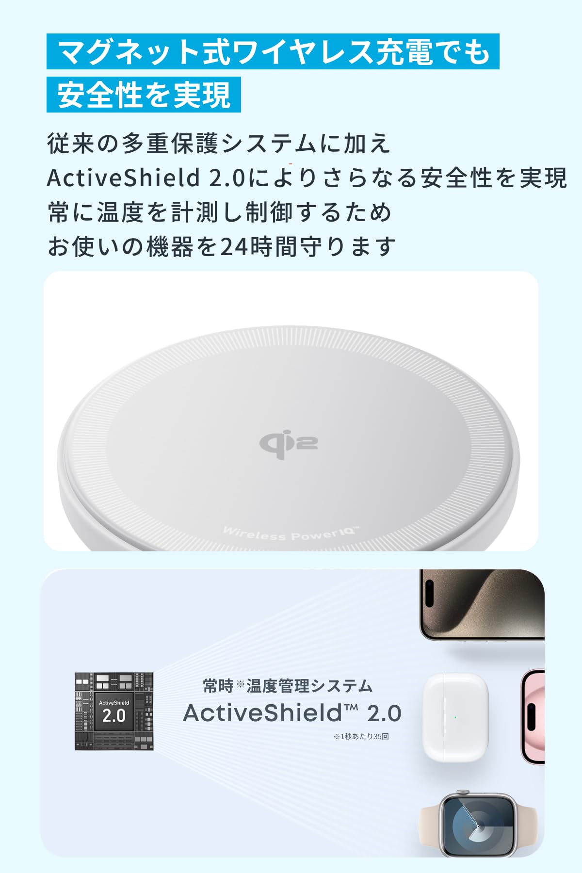 ■ マグネット式ワイヤレス充電でも安全性を実現:従来の多重保護システムに加えActiveShield 2.0によりさらなる安全性を実現、常に温度を計測し制御するためお使いの機器を24時間守ります。