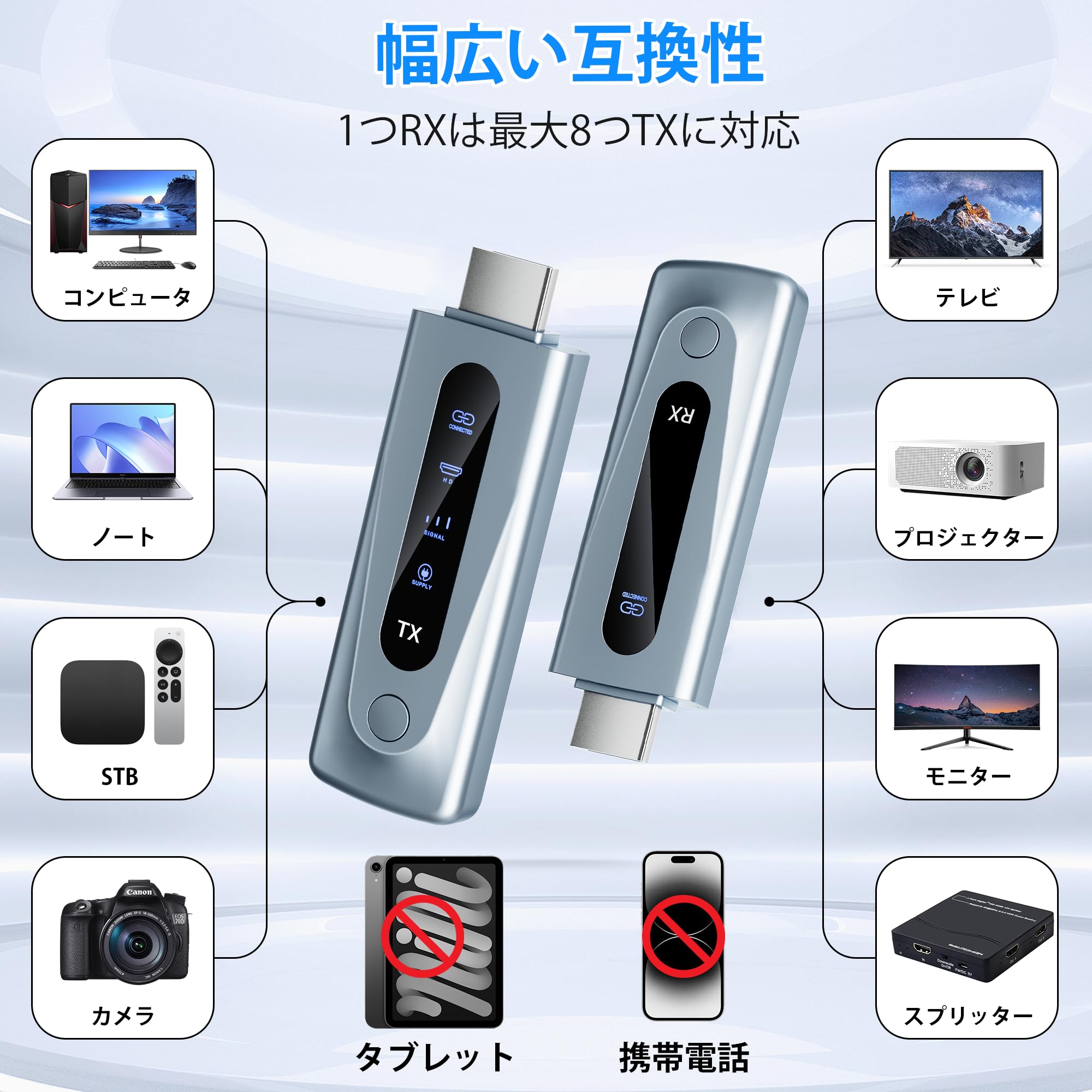 ■ 【幅広い互換性】この無線HDMI送受信機セットは、送信機(TX)がカメラ、Switch、Xbox、PS4、ノートPC、PCなどのデバイスをサポートしており、受信機(RX)はWindows、TV、Mac OS、プロジェクターなどのデバイスをサポートしています。