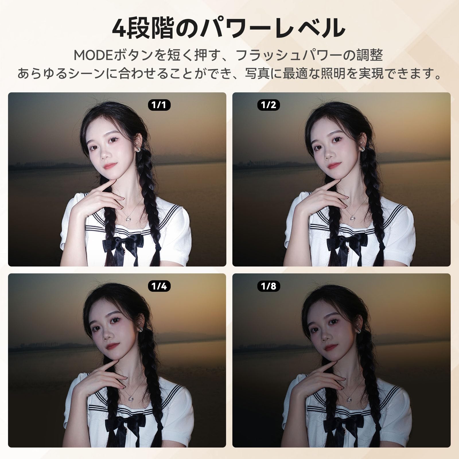 このスピードライトはGN 8(ISO100)、フラッシュの明るさ4 つのレベルから選択でき、CCT 6500Kを備えています。
