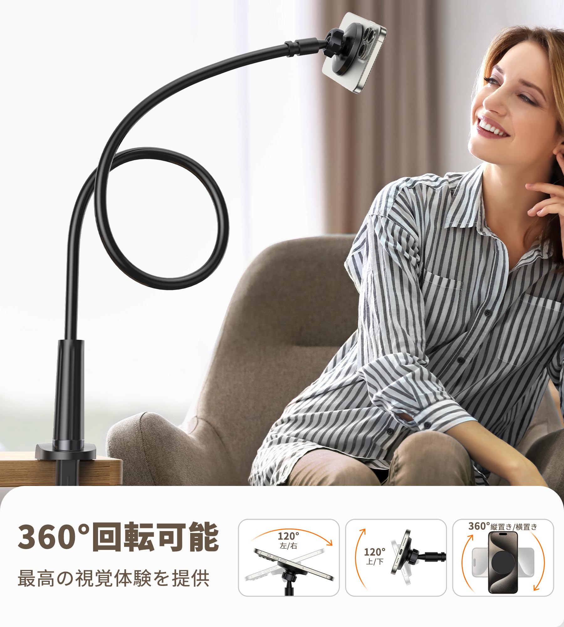 mag-safe 寝ながら スマホアームスタンド 360°回転 マグセーフ フレキシブル アーム 0.1秒吸着 超強磁力 マグネット 耐久合金アーム スマホ ホルダー ベッド 卓上 携帯 ごろ寝 机 デスク アイホン Phone 17/16/ 15/14/13/12 Pro Max/Pro/Plus/Miniに対応 撮影/動画視聴/ライブ配信 自宅