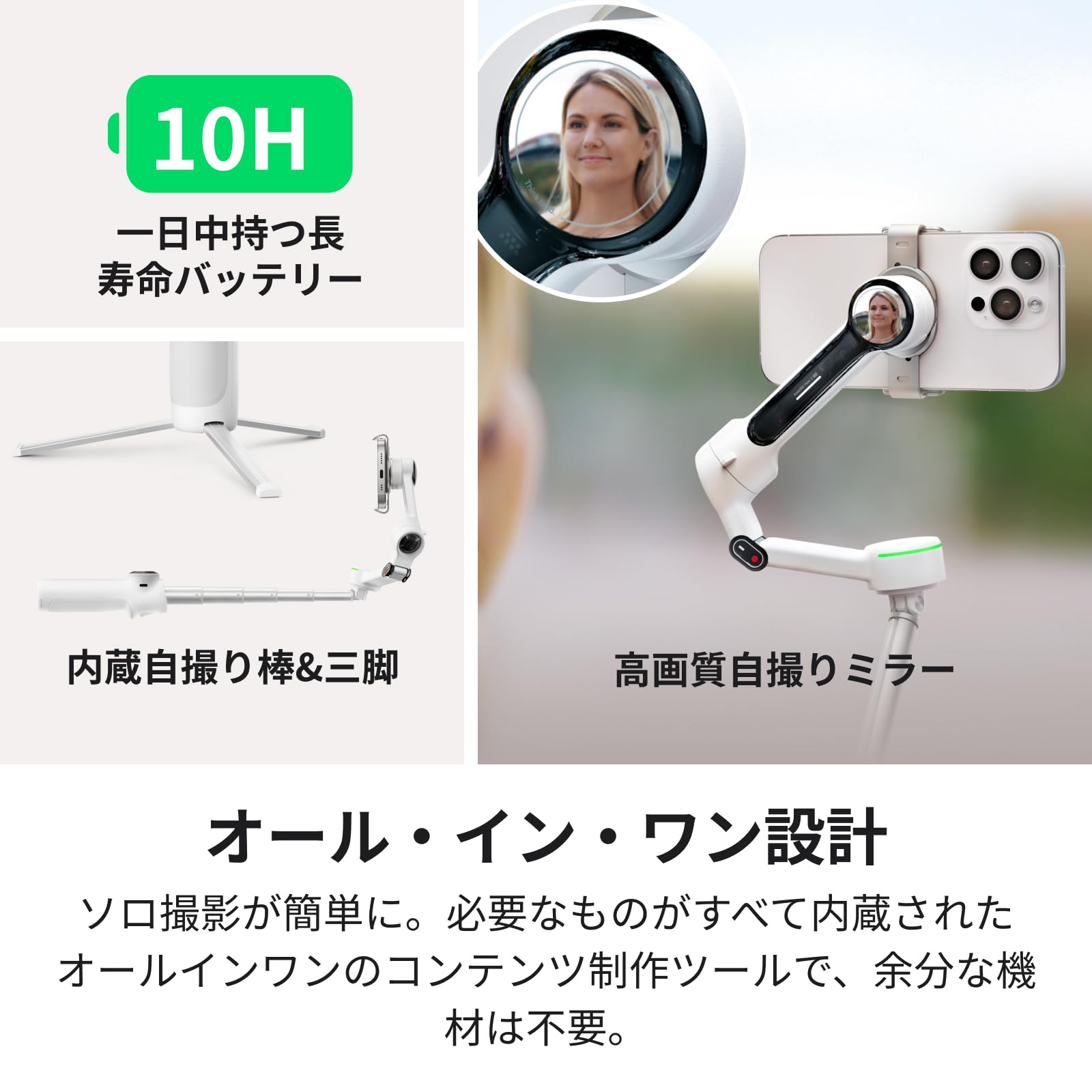 ■ オールインワンのコンテンツ作成ツール:必要なツールが1つになったAIスマホジンバル。