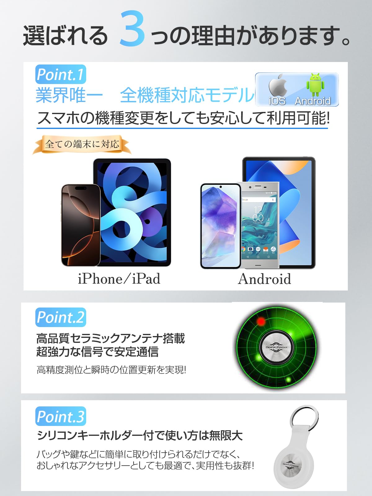 2️⃣iOS・Androidの両方で紛失防止タグ同等以上の精度を維持しながら、Androidユーザー向けに最適化された機能を追加。