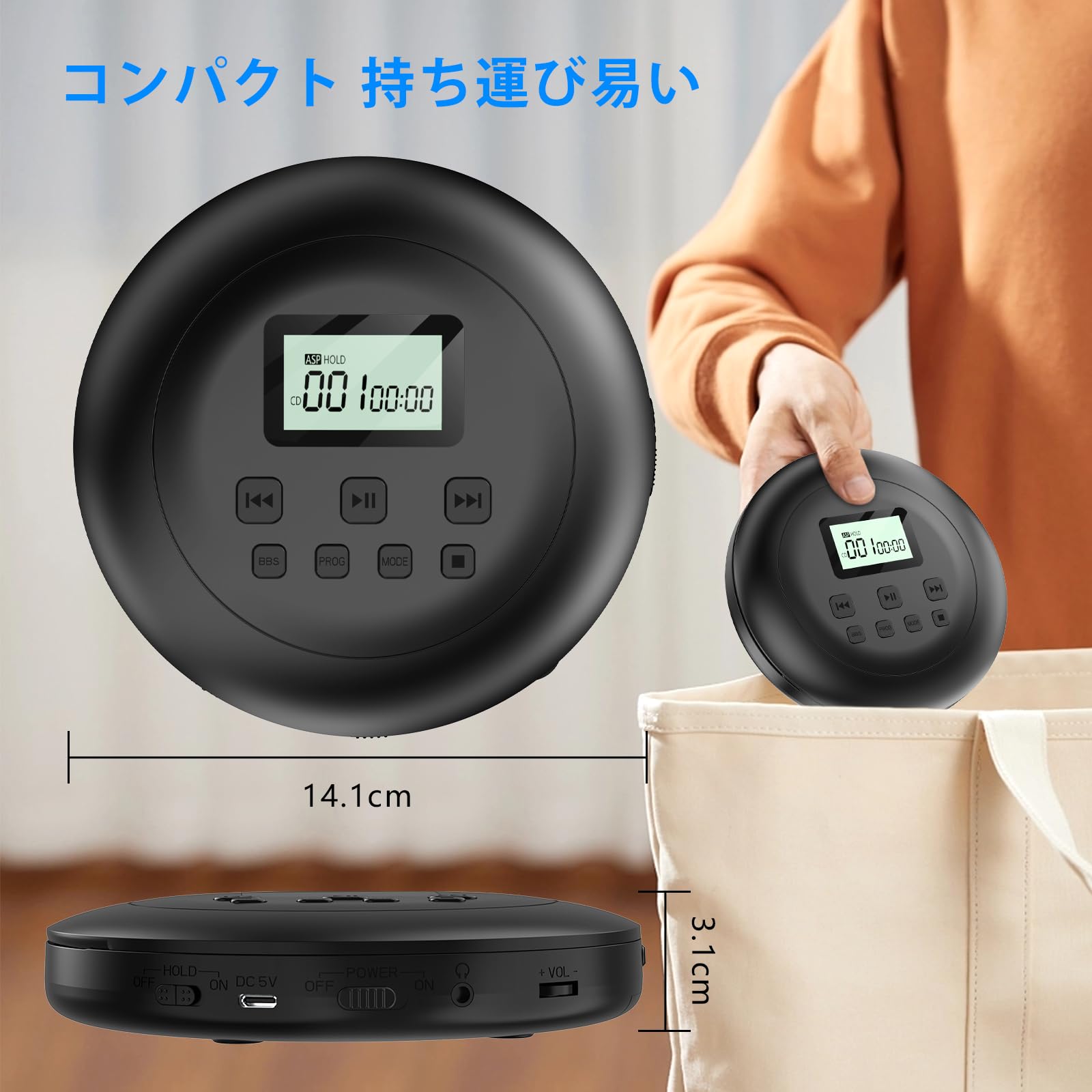ポータブル式CDプレーヤー本体はわずか215gであり、14.1*14.1*3.1CMの超コンパクトのサイズ持ち運び便利です。