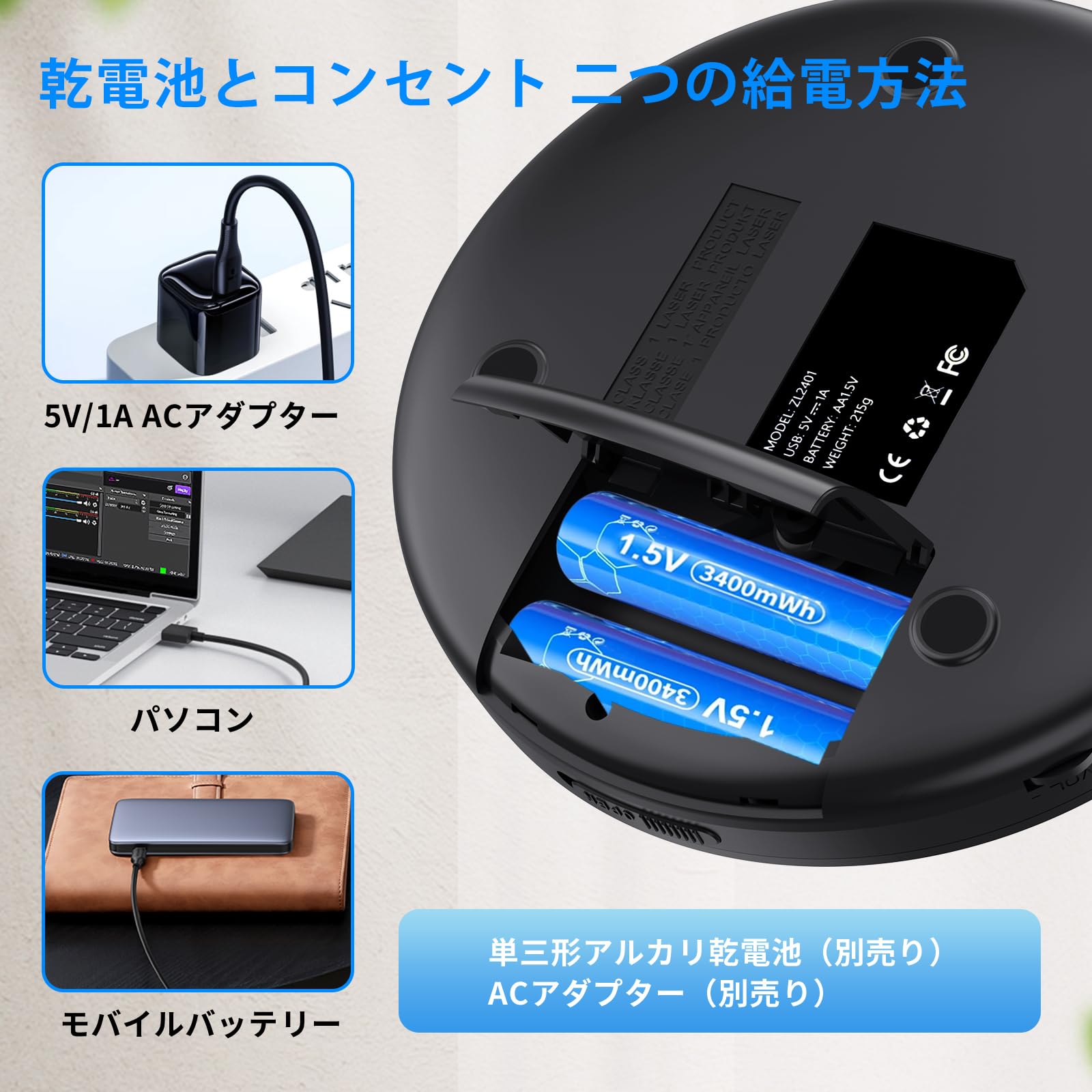 ご注意ください:USB充電機能はUSB経由で電池を充電することで、製品には乾電池が同梱されていないため、新たに乾電池をご用意いただく必要があります。