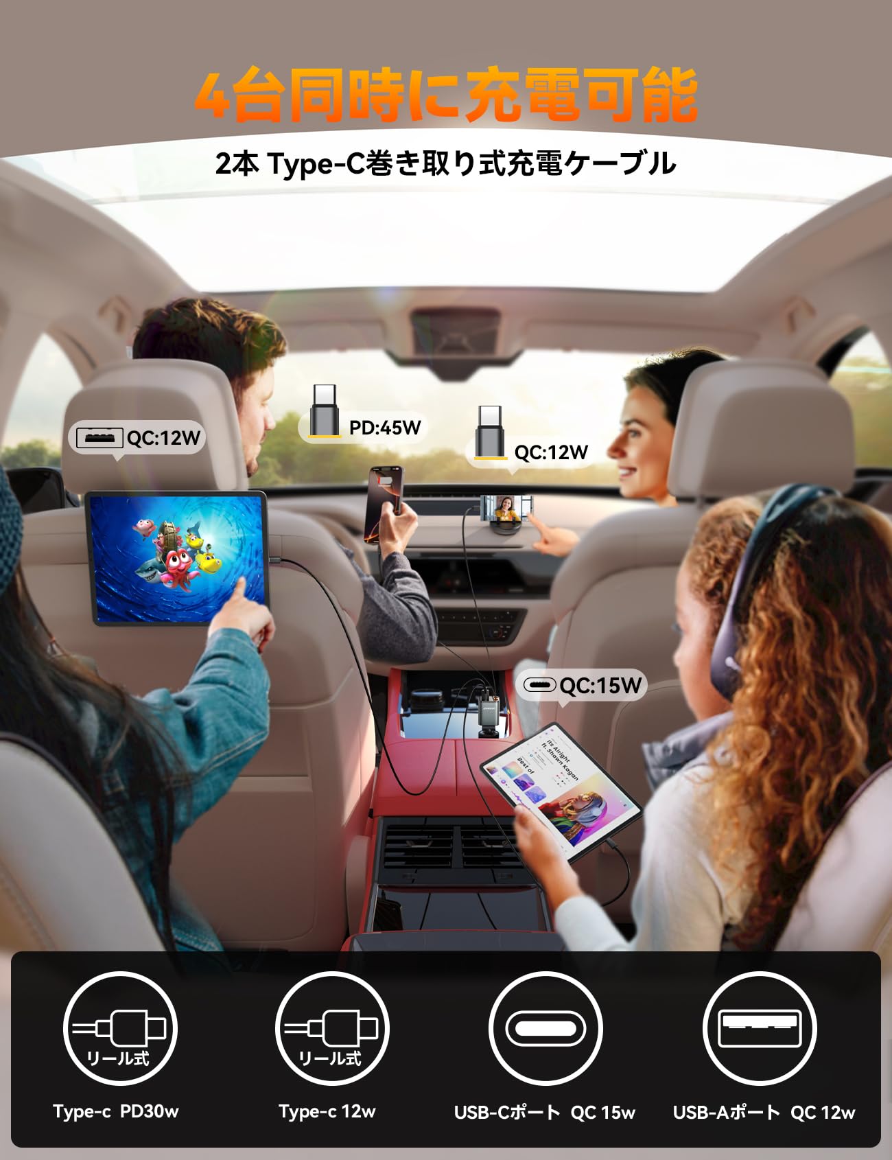 ■ 【4ポート同時充電|最大66Wのパワフル出力】 **4台同時充電対応!**本製品は、2本のType-C巻き取りケーブル+USB-Cポート(QC15W)+USB-Aポート(QC12W)を搭載し、最大66Wの急速充電を実現。