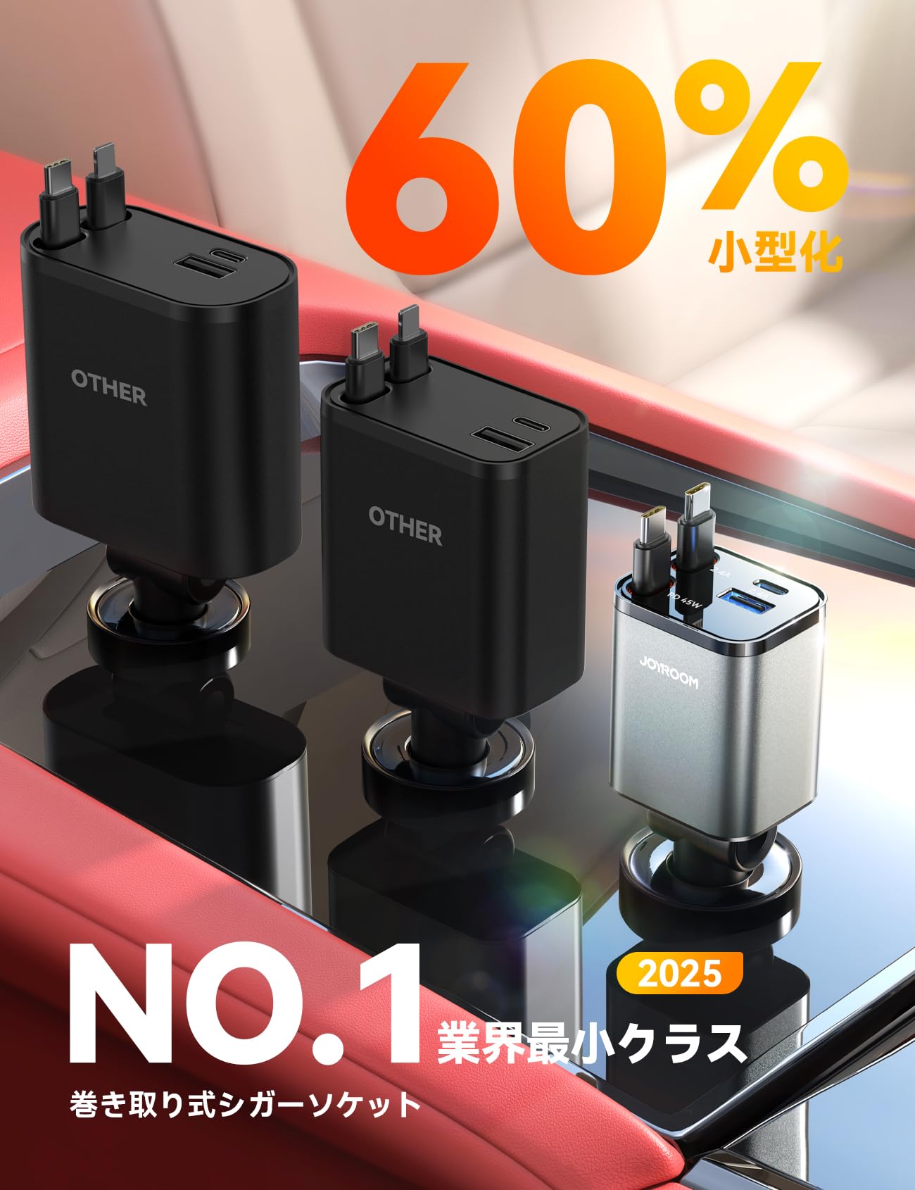■ 【業界最小クラス!40%小型化でスペース節約】 最新設計により、従来品と比べ40%の小型化を実現(4.50cm×3.78cm×12.98cm)!一般的な車 充電器 巻き取りと比べても圧倒的にコンパクトで、車内のドリンクホルダーやダッシュボード周りにスッキリ設置可能。