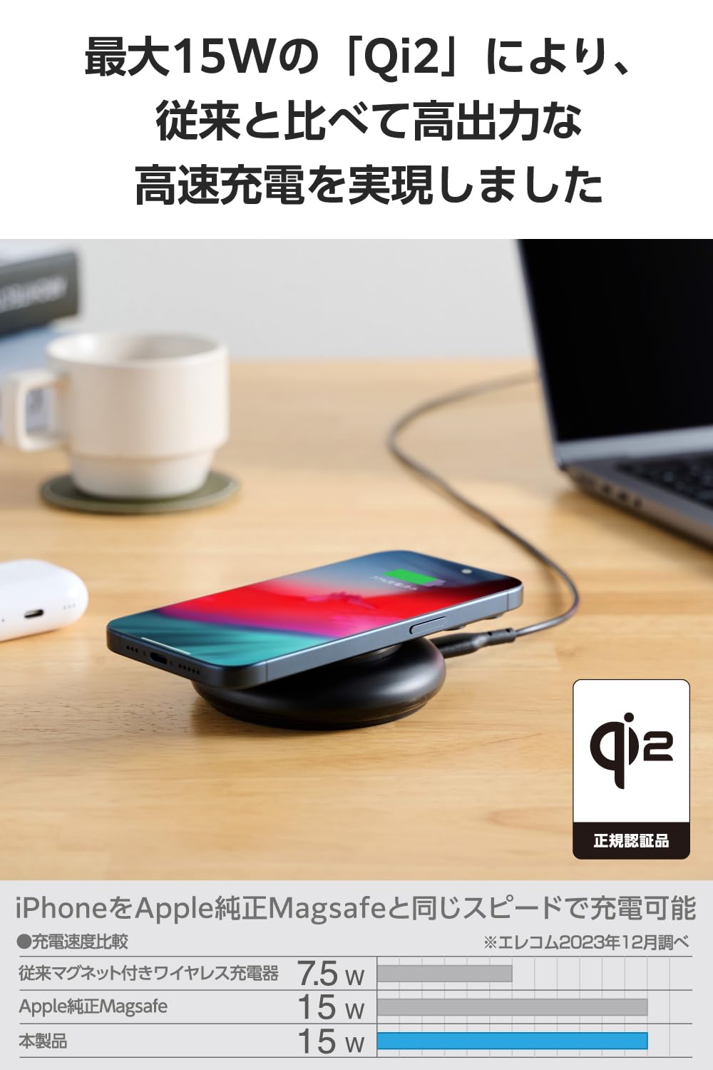 エレコム Qi2 充電器 スタンド 15W Type-C入力 折りたたみ可能 正規認証品 【iPhone 16/15/14シリーズ対応】 ブラック EC-MA08BK