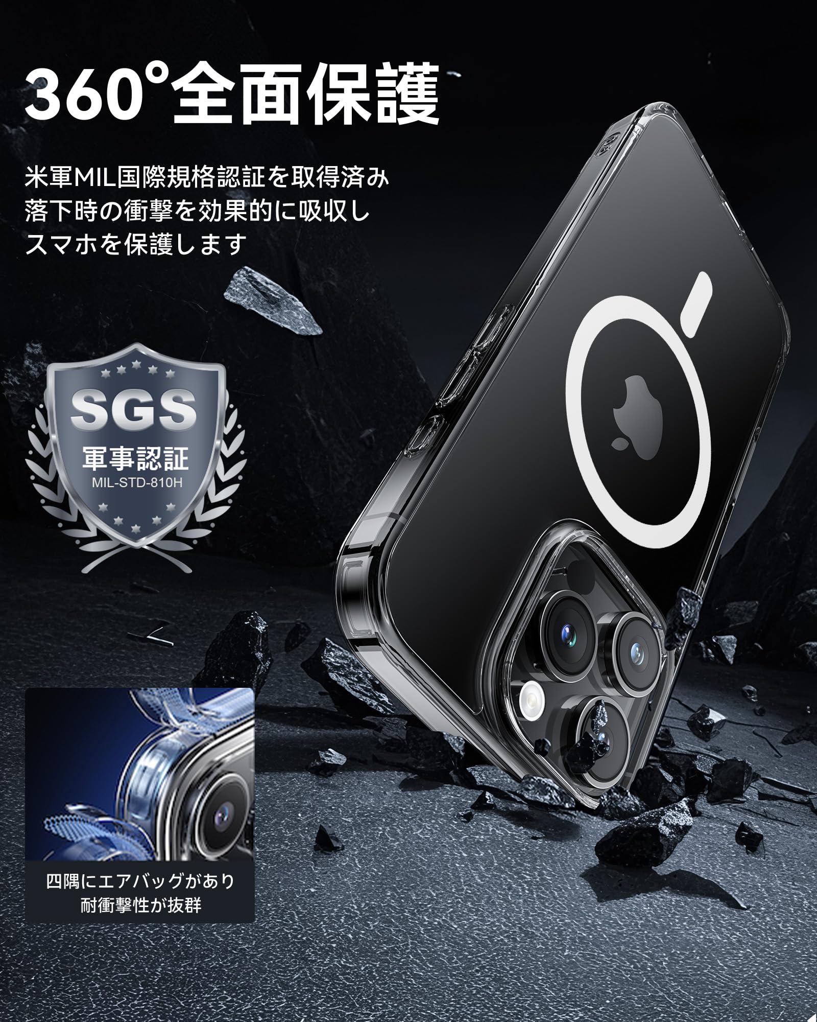 ■ 【MagSafe対応・強力な磁力吸着】スマホケース内部に38個の強力なN52マグネットを搭載しており、一瞬でピッタリと高速充電を実現!また、ワイヤレス充電やモバイルバッテリー・車載ホルダー・スタンド・リングなど全てのMagSafe対応アクセサリーにもばっちり対応しています。