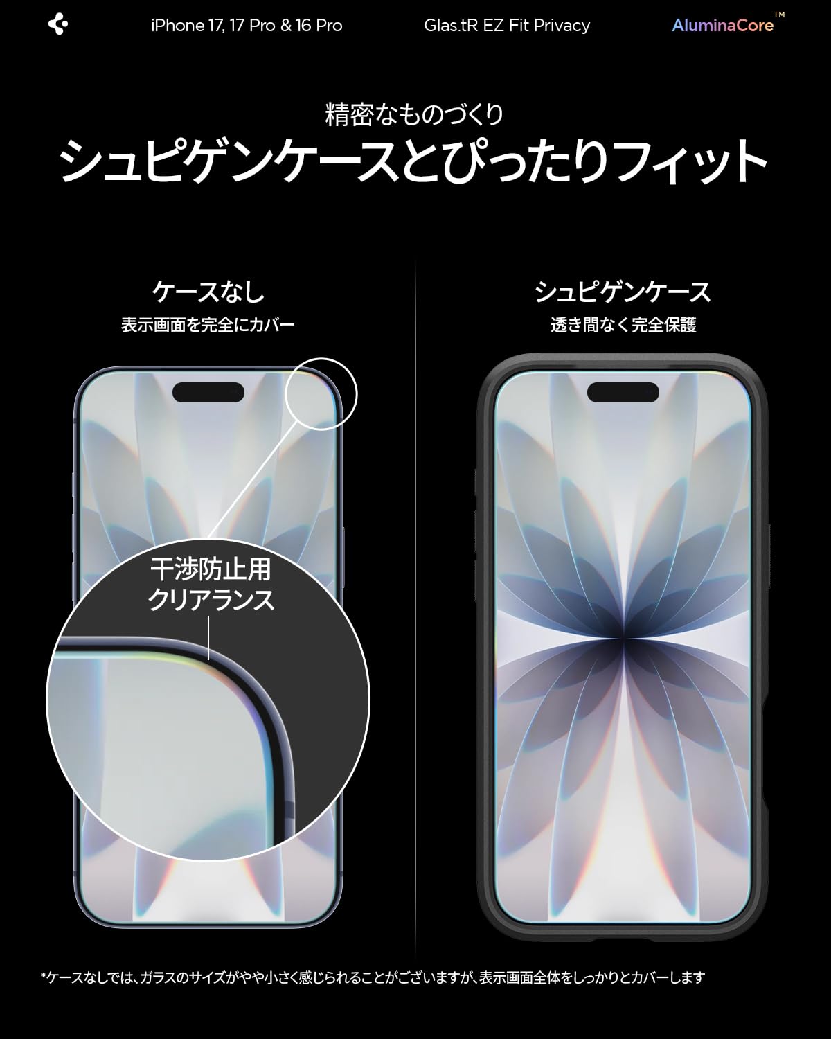 Spigen iPhone 17/17 Pro ガラスフィルム iPhone 16 Pro 対応 覗き見防止 9H+硬度強化ガラス 米軍規格落試験済み アルミナコア 貼り付けトレイ付き プライバシーフィルム ナノコーティング 飛散防止 2枚入 EZ Fit AGL07929