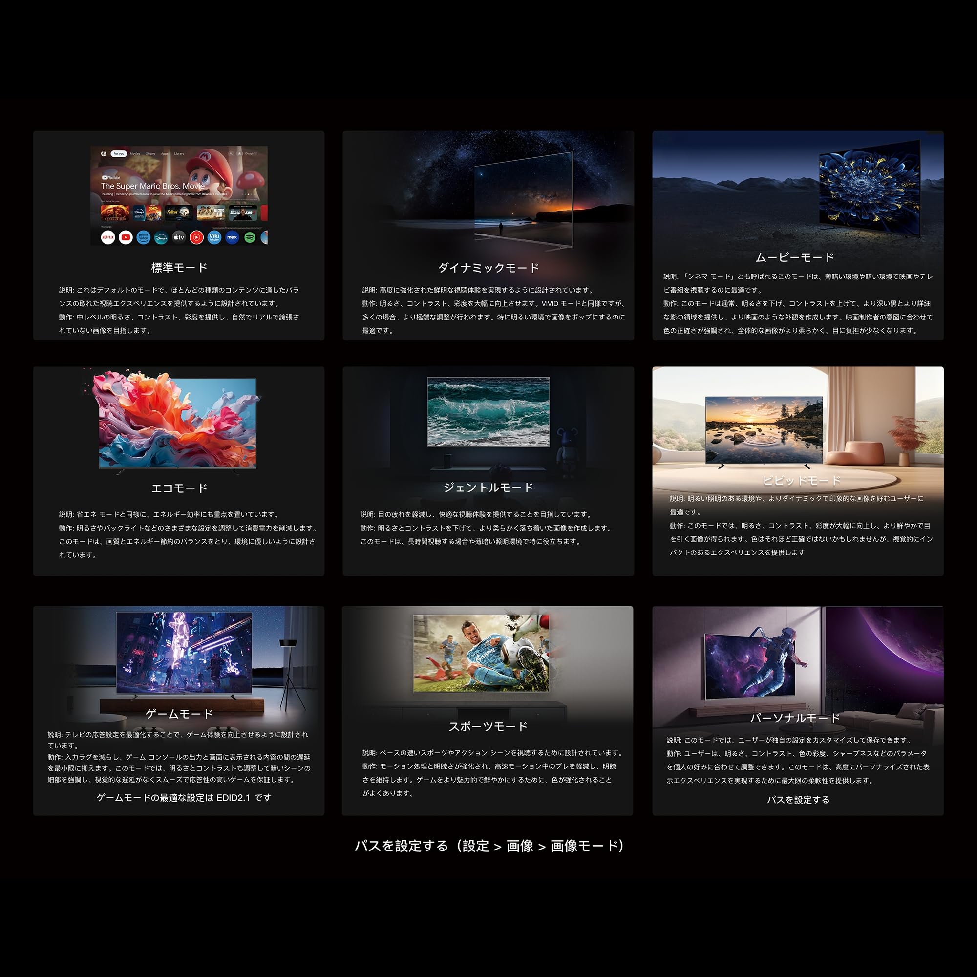 (ALLM(自動低遅延モード)設定、ゲームモードの設定をサポート、HDMI2.1対応)9 つの異なる使用モードは、あらゆる使用ニーズを満たす設定をサポートします。