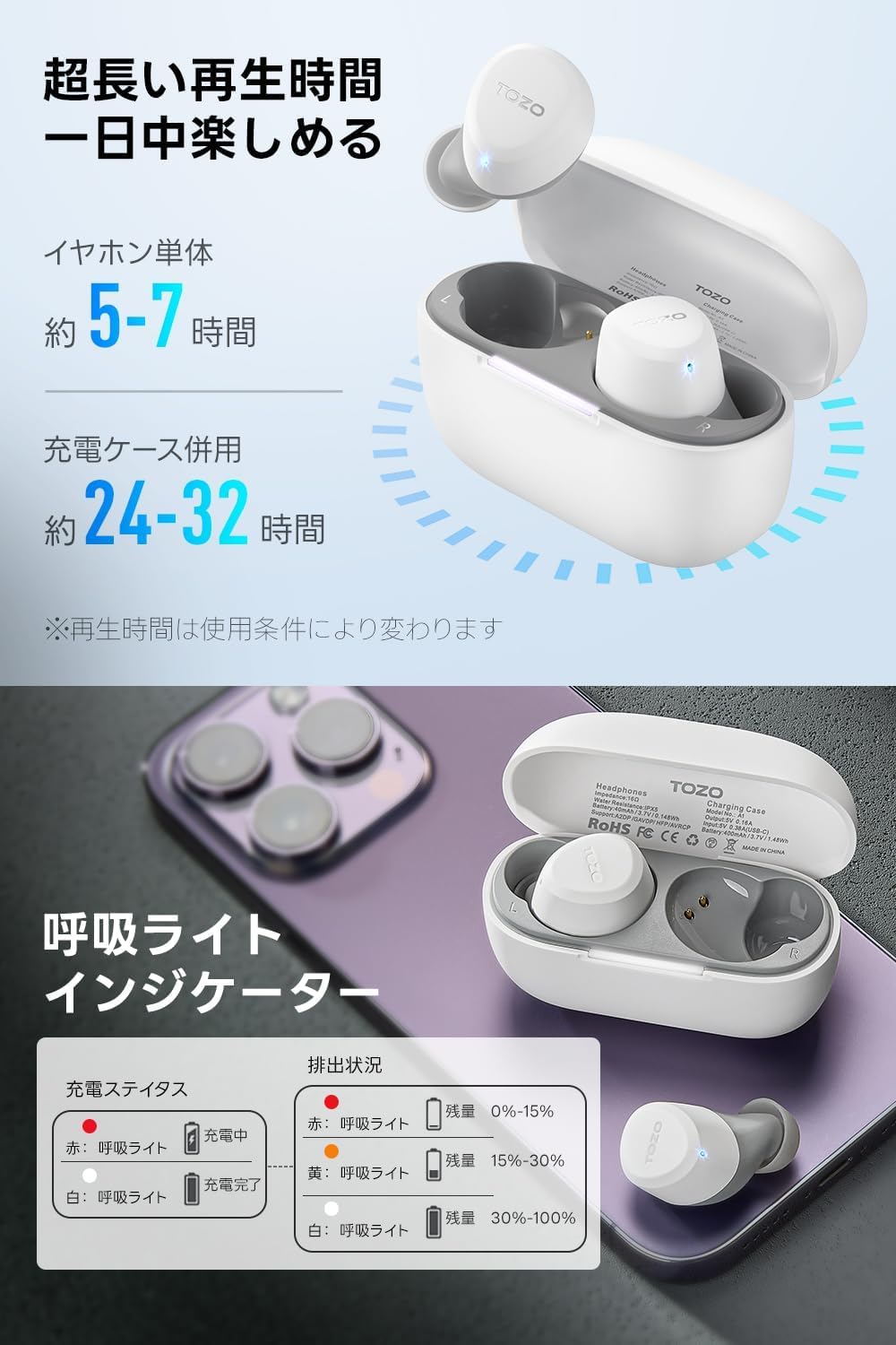TOZO A1 イヤホン bluetooth ワイヤレスイヤホン 中低音域 暖色系音質 小型軽量 マイク内蔵 通話時ENC ノイズキャンセリング カスタムEQ アプリ対応 防水 最大約32時間の連続再生 ぶるーとゅーす イヤフォン USB-C充電 カナル型 スポーツ/通勤/通学/WEB会議(ホワイト