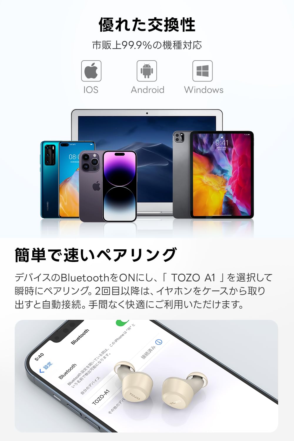初回のみ手動でデバイスとペアリングが必要ですが、一度設定すれば、イヤホンに触れるだけで瞬時に音楽が再生され、スムーズに楽しめます。