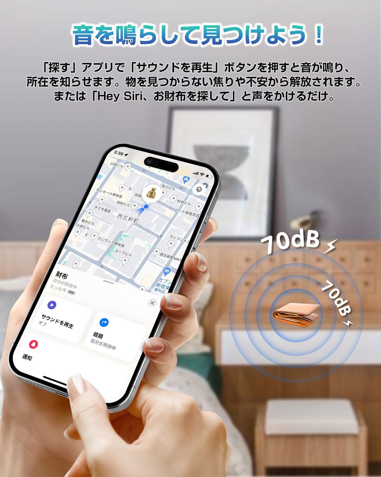 まはた「Hey Siri、お財布を探して」と声をかけるだけ。
