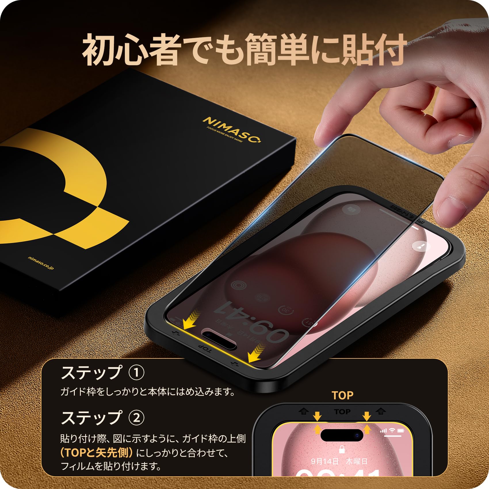 NIMASO 覗き見防止 iPhone 15 用 ガラスフィルム 全面保護 のぞき見防止 黒縁あり 強化ガラス フィルム 高感度タッチ ガイド枠付き 2枚セット アイフォン 15(6.1インチ)対応 NSP23K906