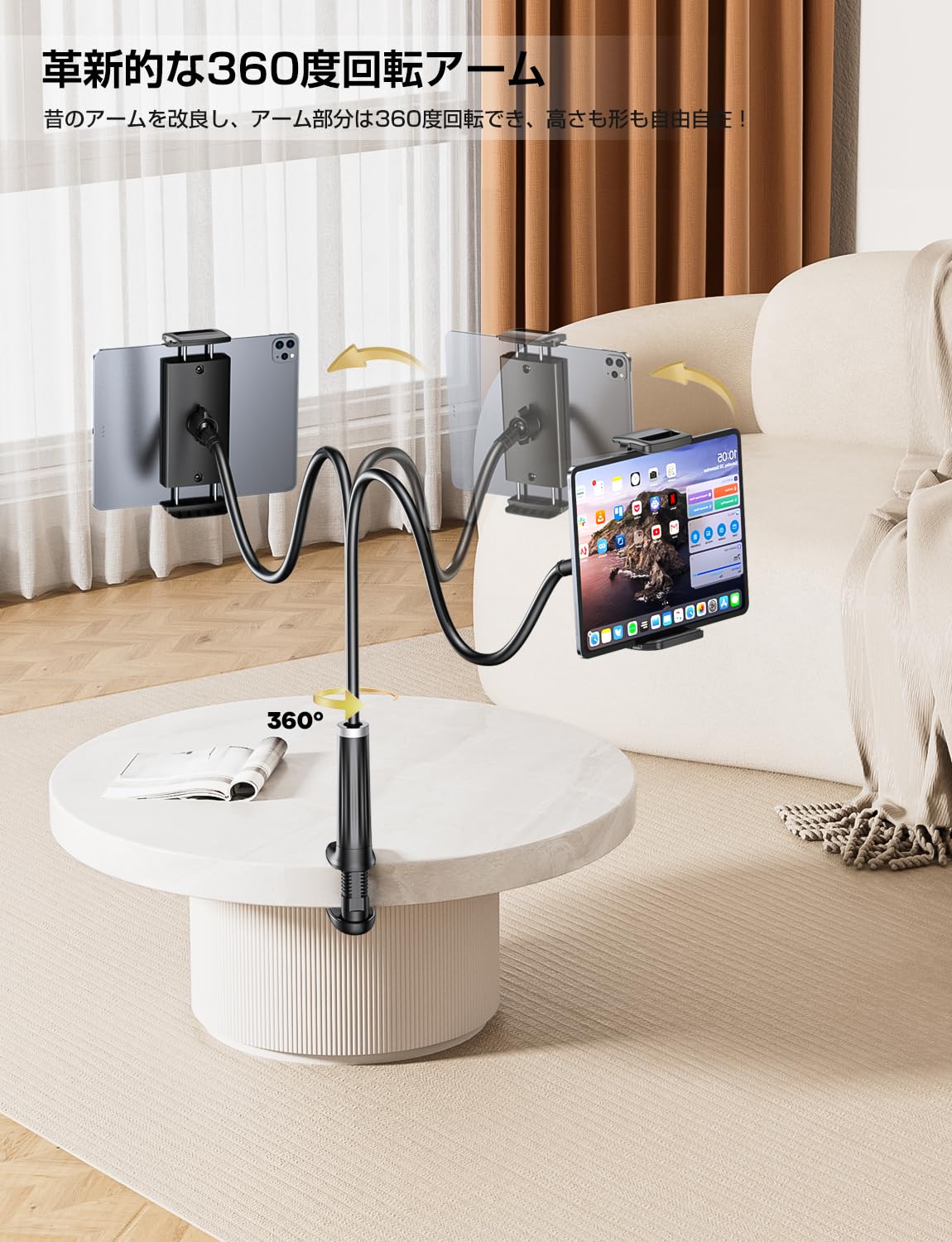 ■ 【快適なタブレットライフ】フレキシブルアームは、目線に合わせて細かな調整ができるだけではなく、タブレットを手で持つことのかわりに固定できます。